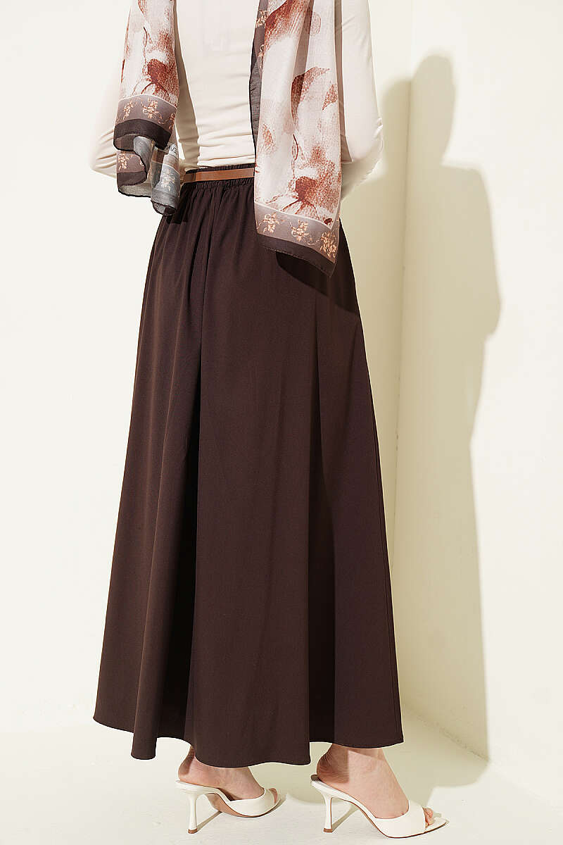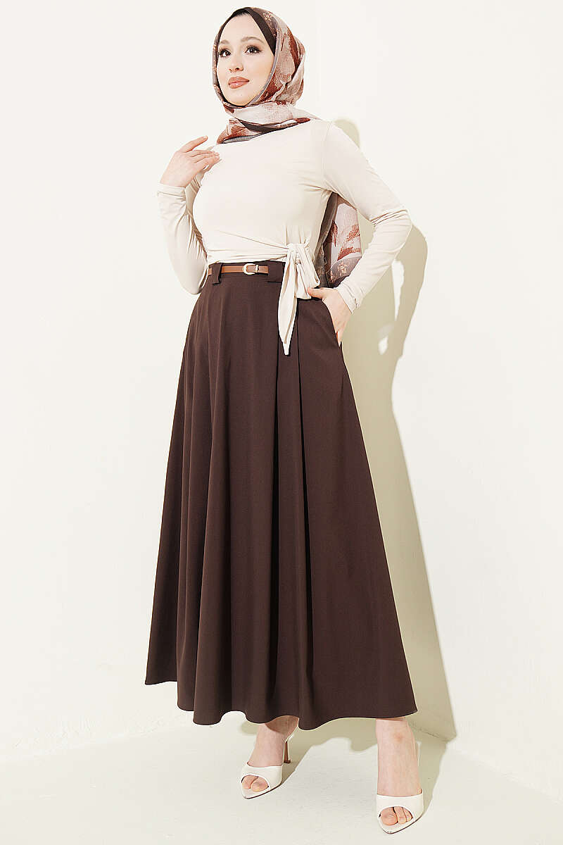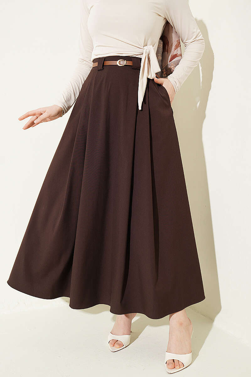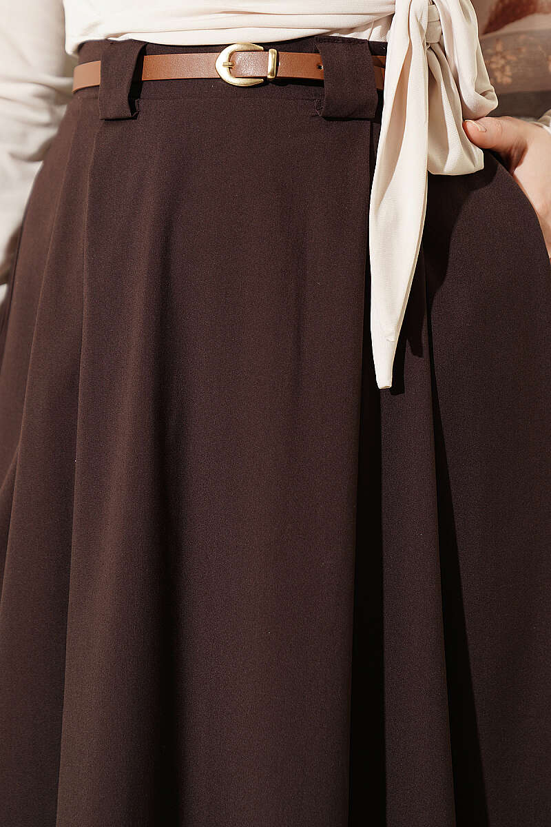 Kuşaklı Kat Detaylı Kloş Etek Kahve