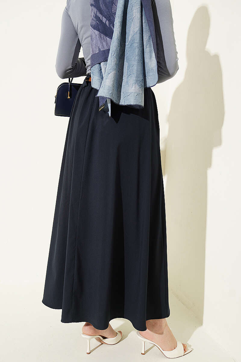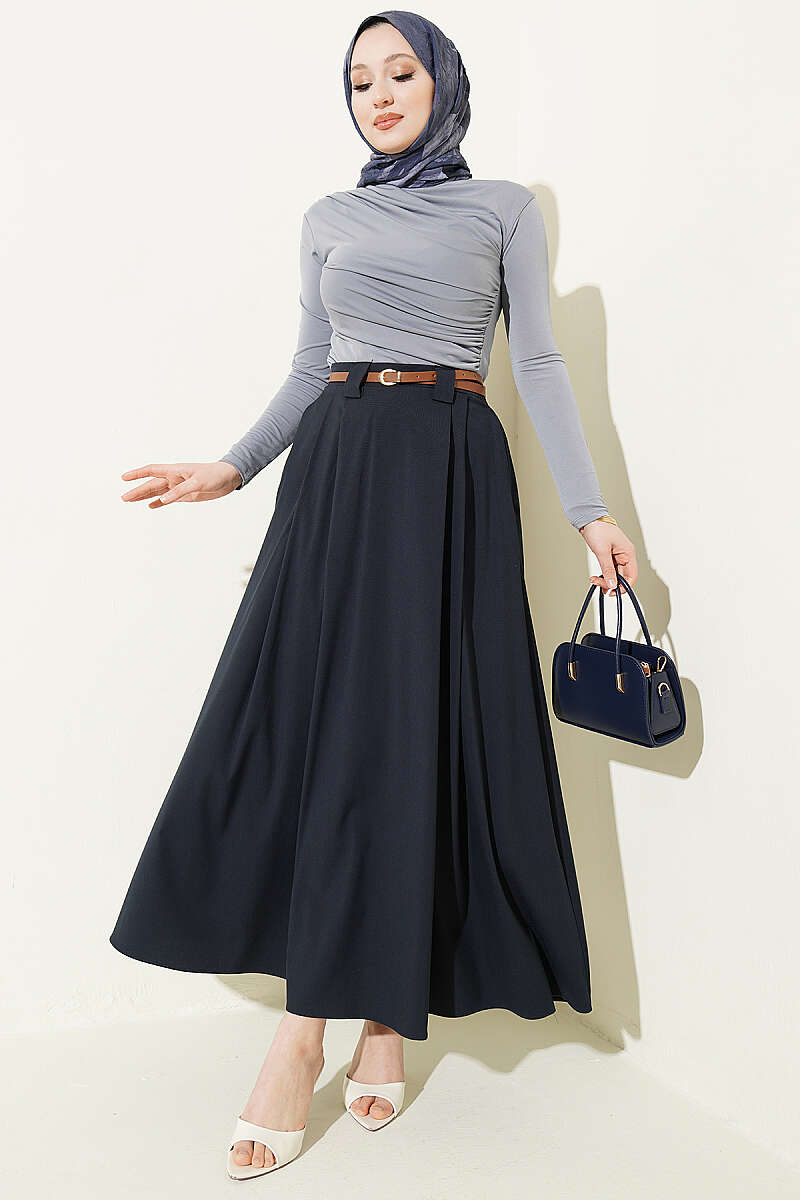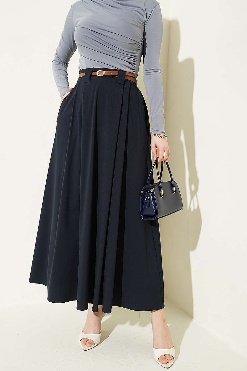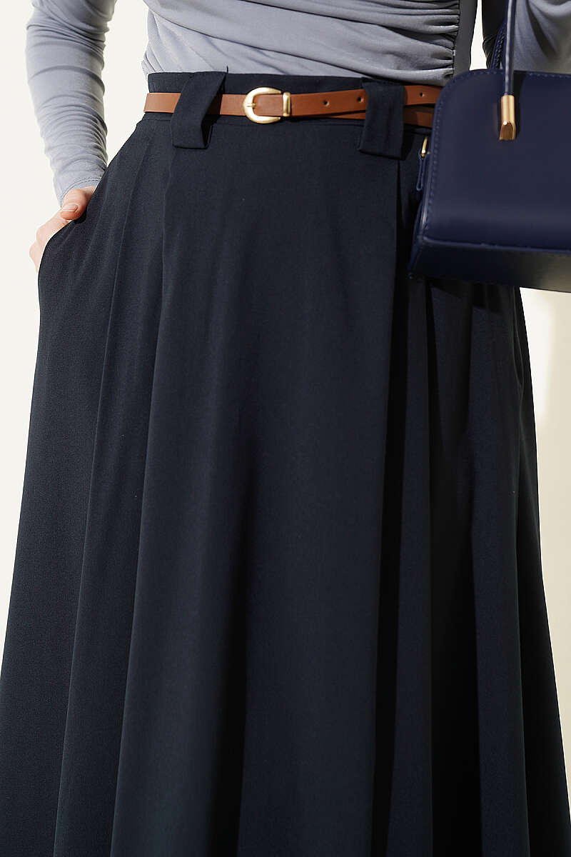 İnce Kemerli Pile Detaylı Etek Lacivert