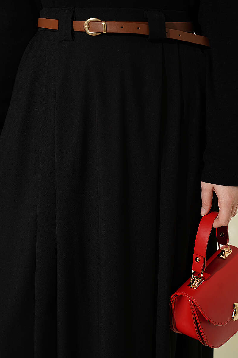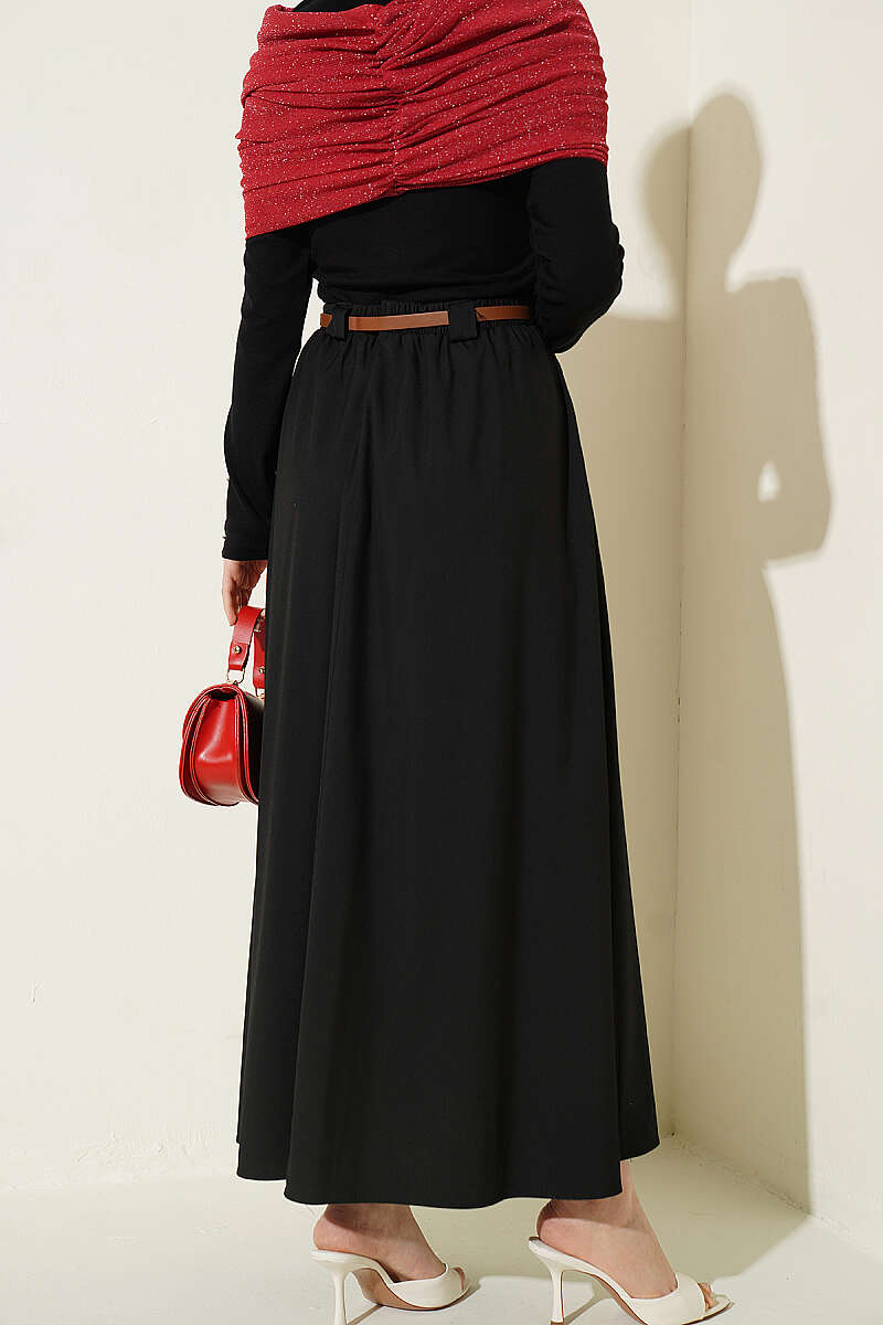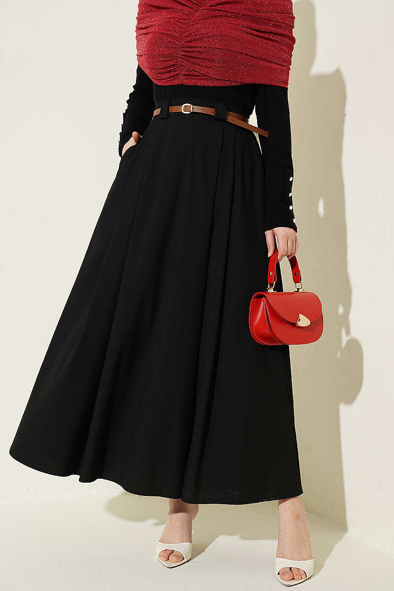 Zarif bir silüet sunan bu etek, bel kısmındaki ince kemer detayı ile vücut hatlarını naif bir şekilde vurgulayarak şıklığı ön plana çıkarıyor. Tasarımın bütününe hakim olan hafif pileli yapısı, her adımda dökümlü ve dinamik bir hareket alanı sağlarken kumaşın kalitesini de gözler önüne seriyor. Yan kısımlarında bulunan işlevsel cep detayları, klasik duruşuna modern ve pratik bir dokunuş ekleyerek günlük kullanıma uygun hale getiriyor. Hem ofis şıklığında hem de özel günlerde rahatlıkla tercih edilebilecek bu parça, zamansız tasarımıyla gardırobunuzun kurtarıcı parçalarından biri olmaya aday.