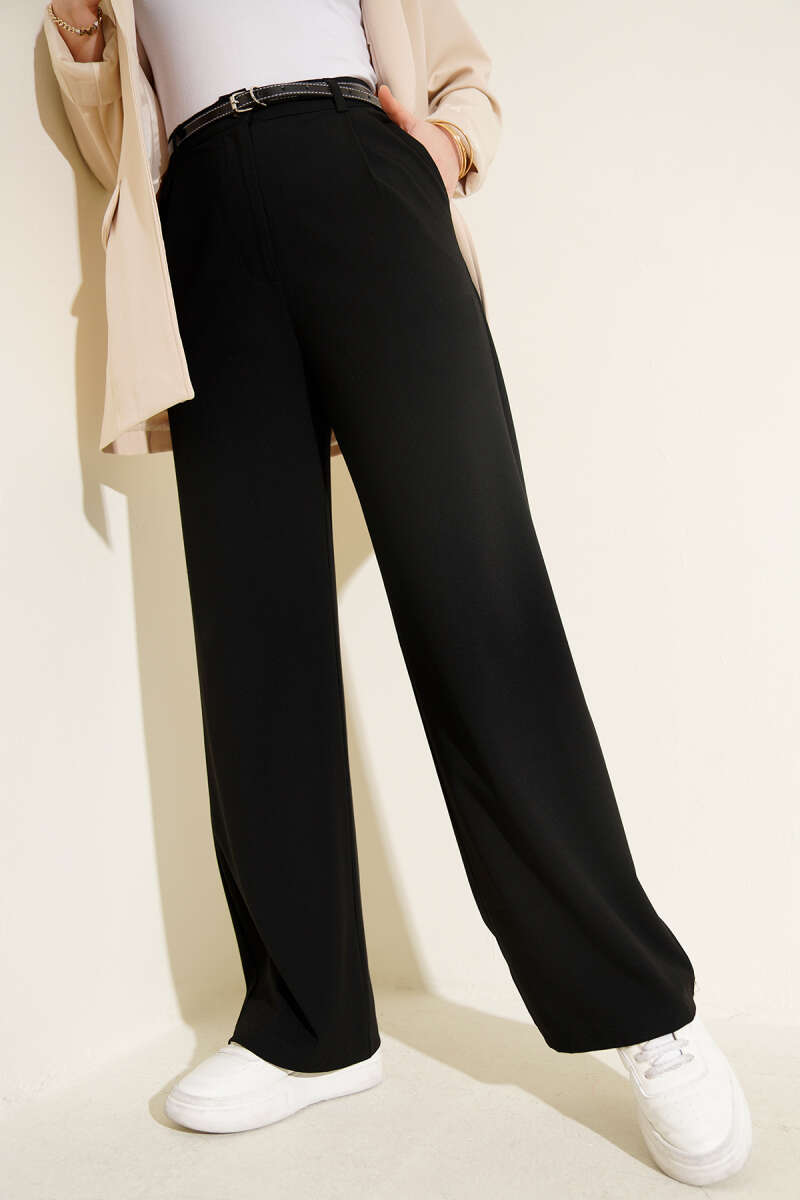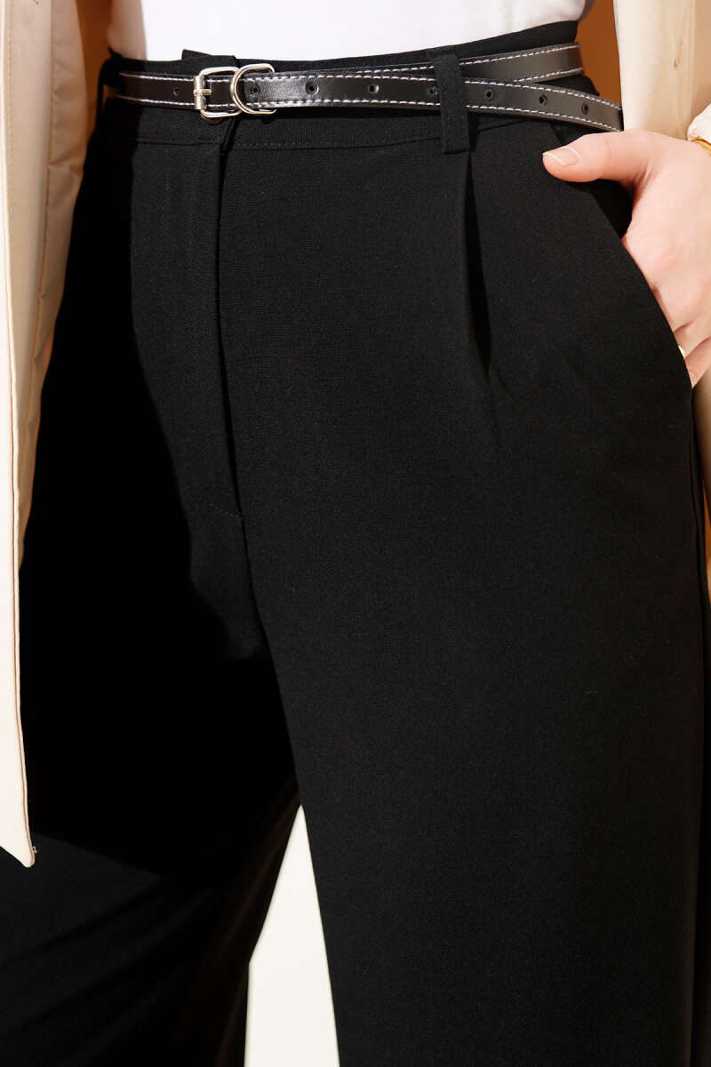 İnce Kemerli Pileli Kumaş Pantolon Siyah