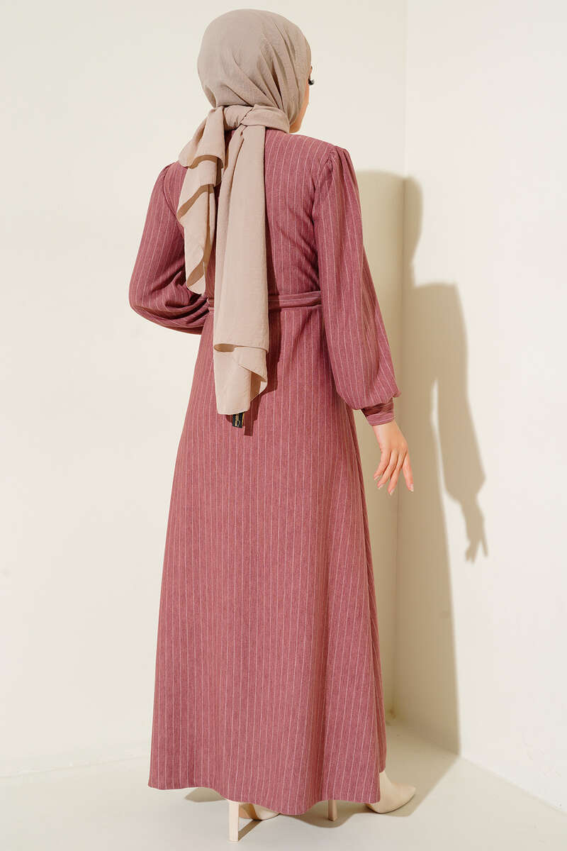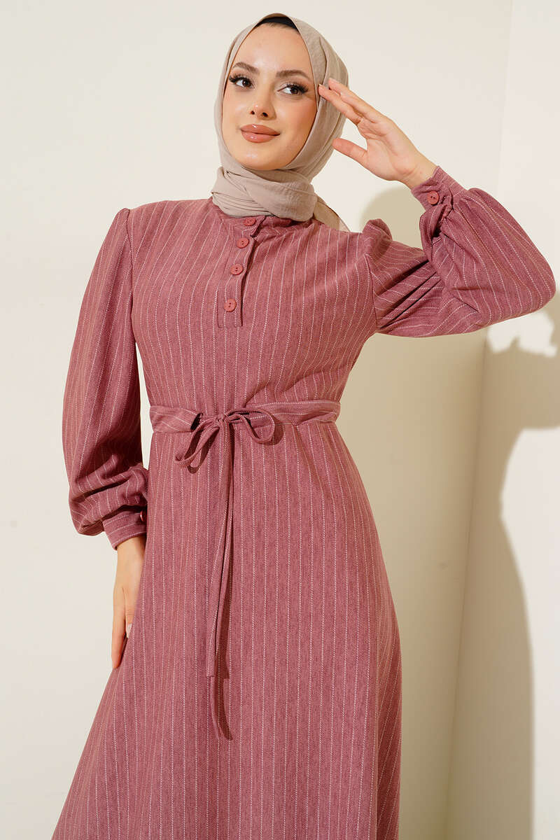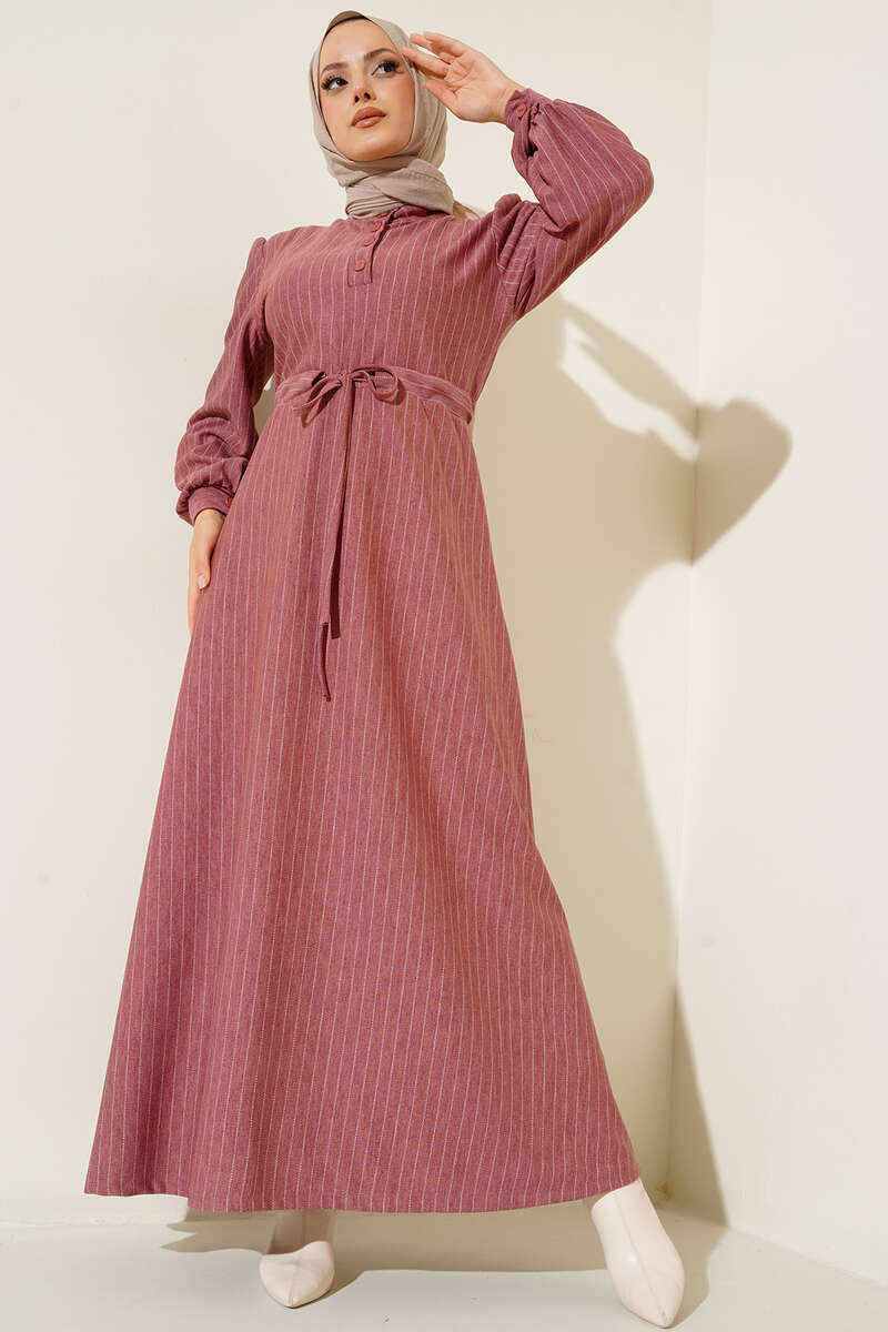 Yeni sezon elbisemiz rahat bir kullanım veve şık bir görünüm sunmaktadır. İnce kesik çizgileriyle detaylanan elbisemiz hakim yakadır. Yakasına eşlik eden dört adet düğmesi bulunmaktadır. Beli tünelli ip bağlamalı olan elbisemizin manşetleri de düğmelidir.