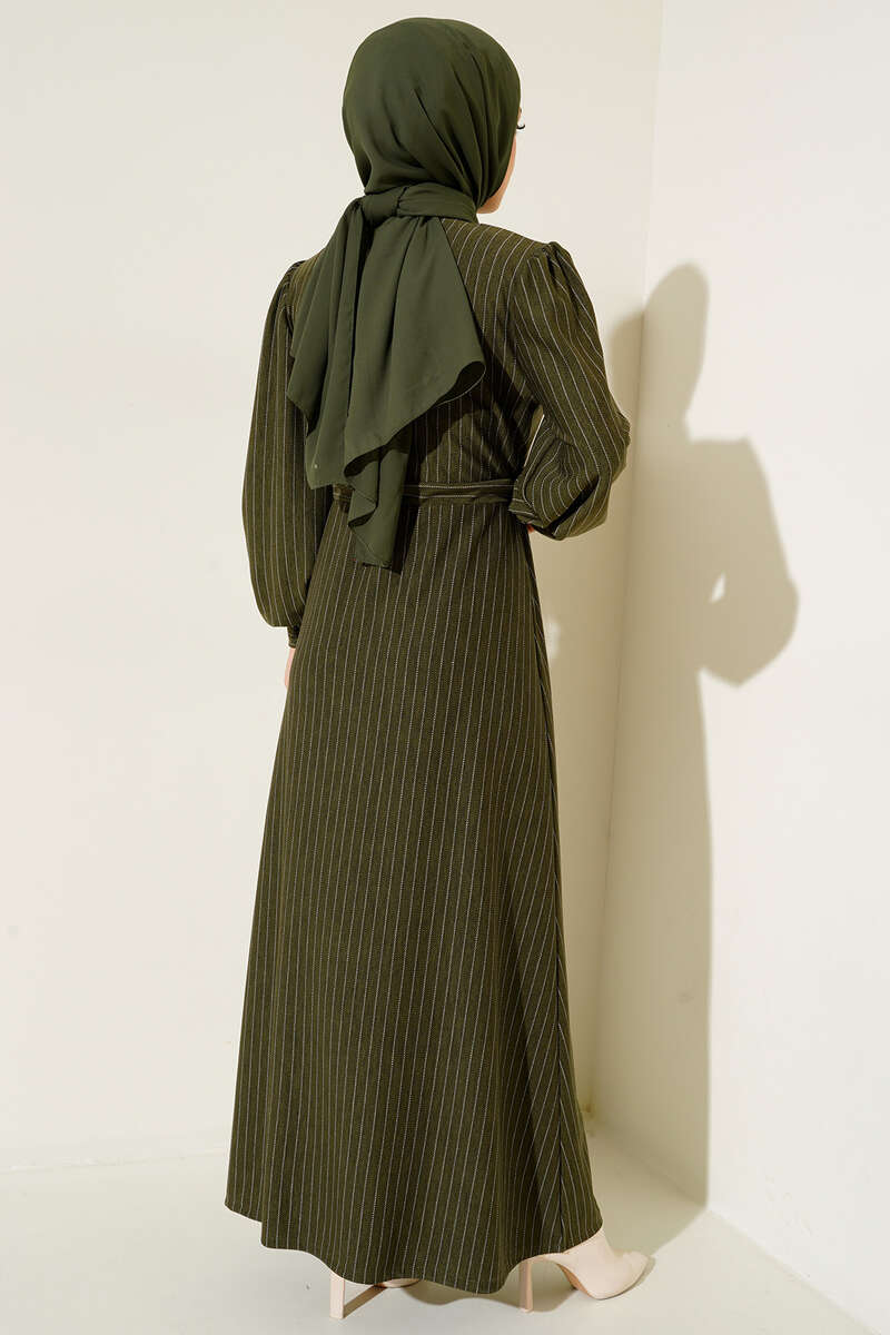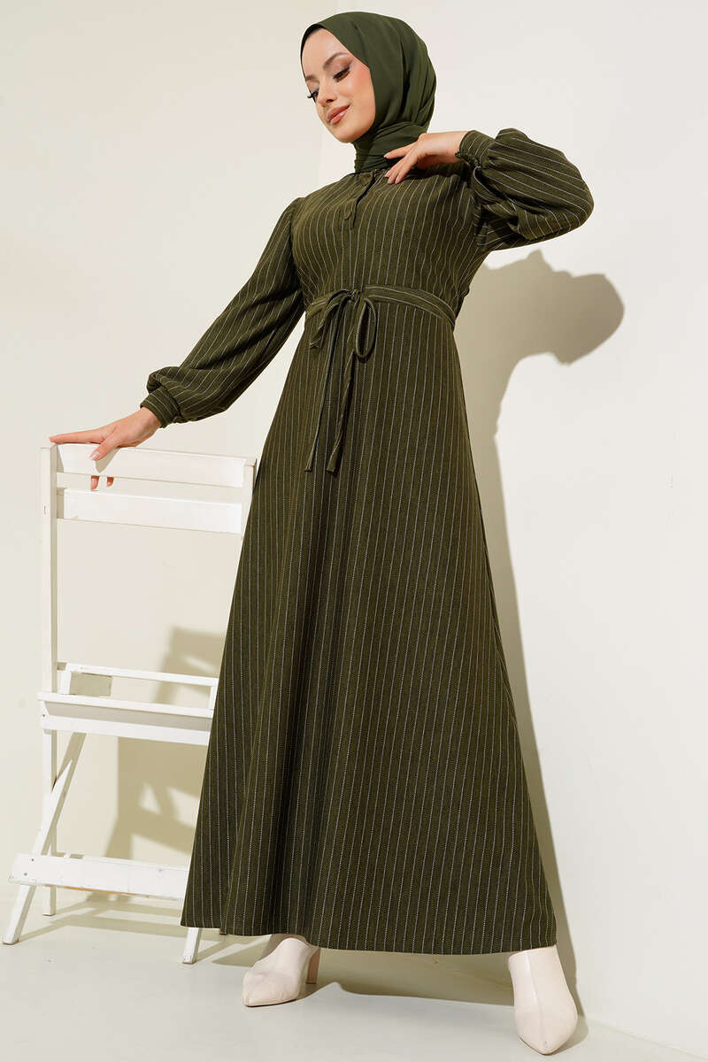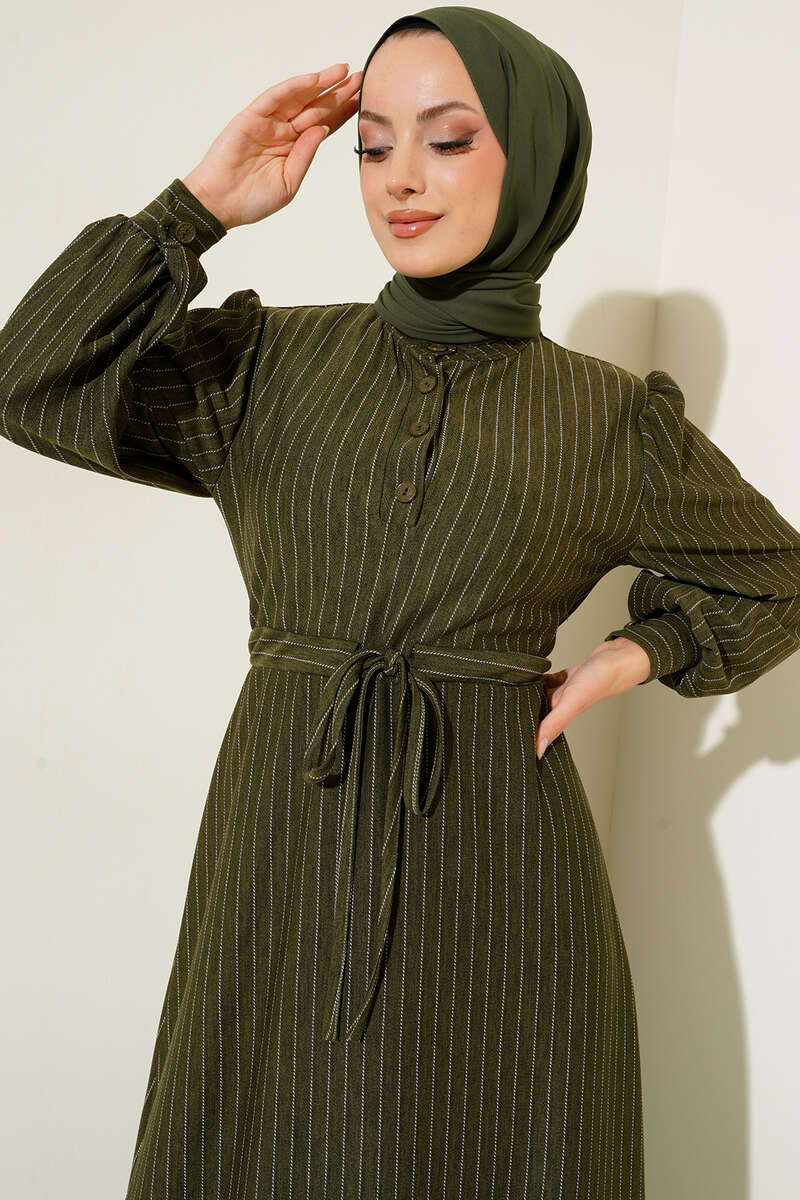 Yeni sezon elbisemiz rahat bir kullanım veve şık bir görünüm sunmaktadır. İnce kesik çizgileriyle detaylanan elbisemiz hakim yakadır. Yakasına eşlik eden dört adet düğmesi bulunmaktadır. Beli tünelli ip bağlamalı olan elbisemizin manşetleri de düğmelidir.