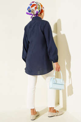 Mini Çiçekli Göğüs Cepli Kot Gömlek Koyu Mavi