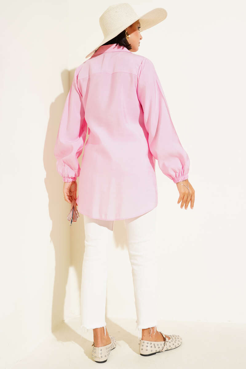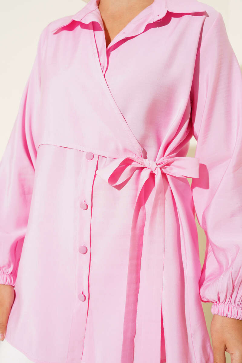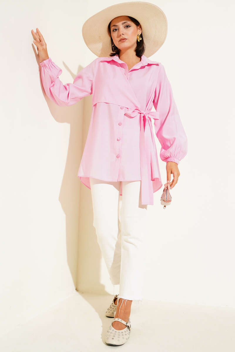 Gizli Düğmeli Bel Kuşaklı Gömlek Pembe