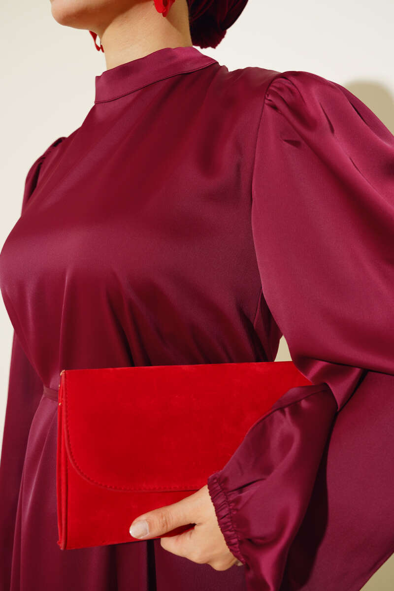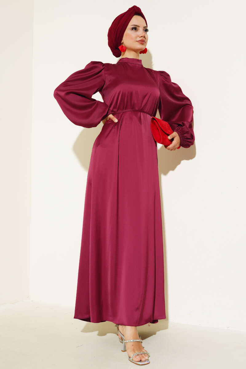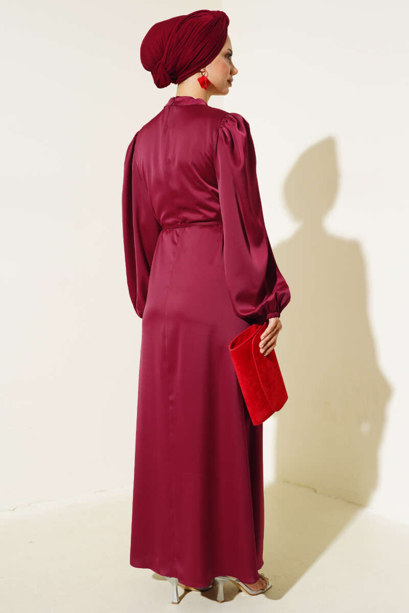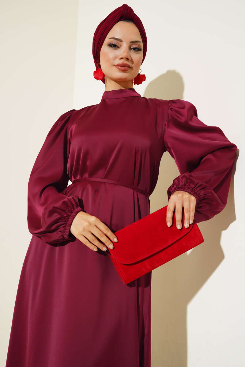 İnce Kuşaklı Kol Lastikli Saten Elbise Bordo