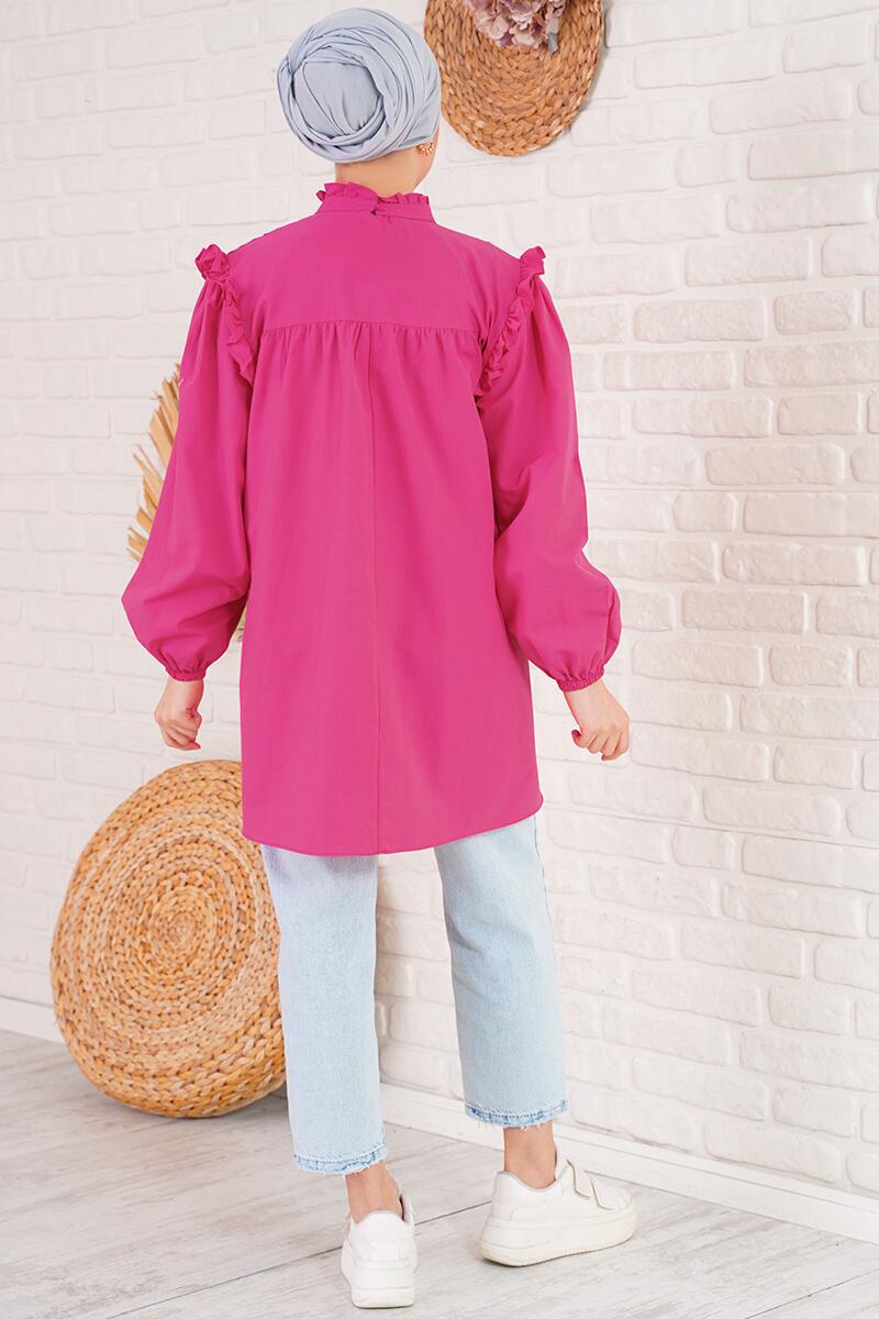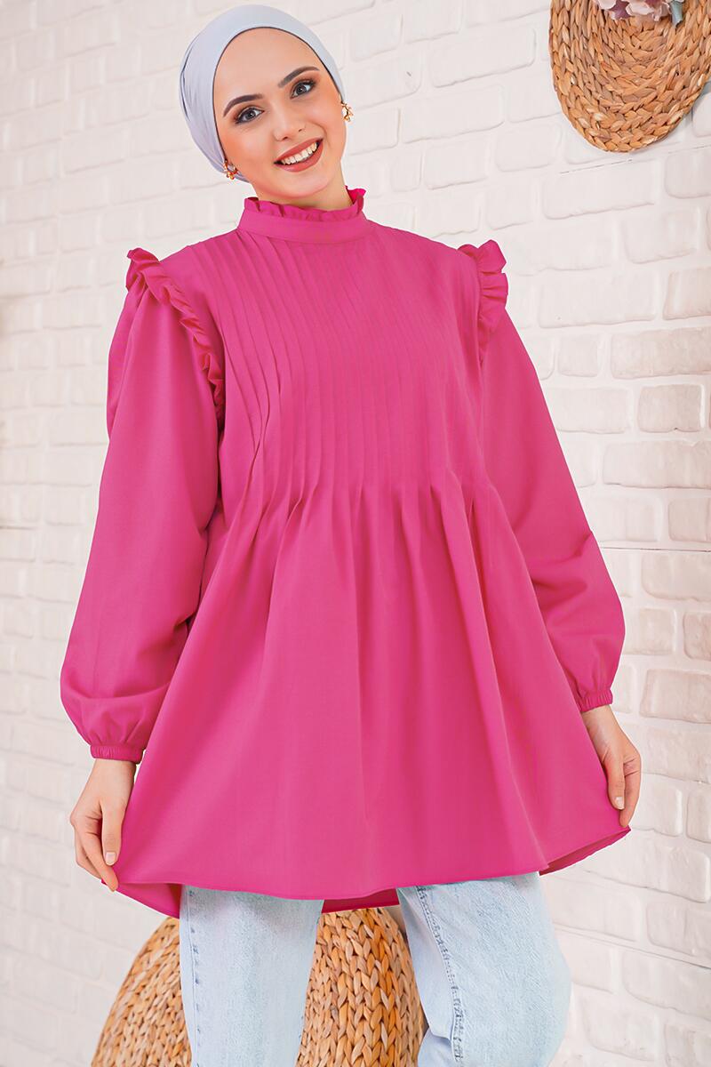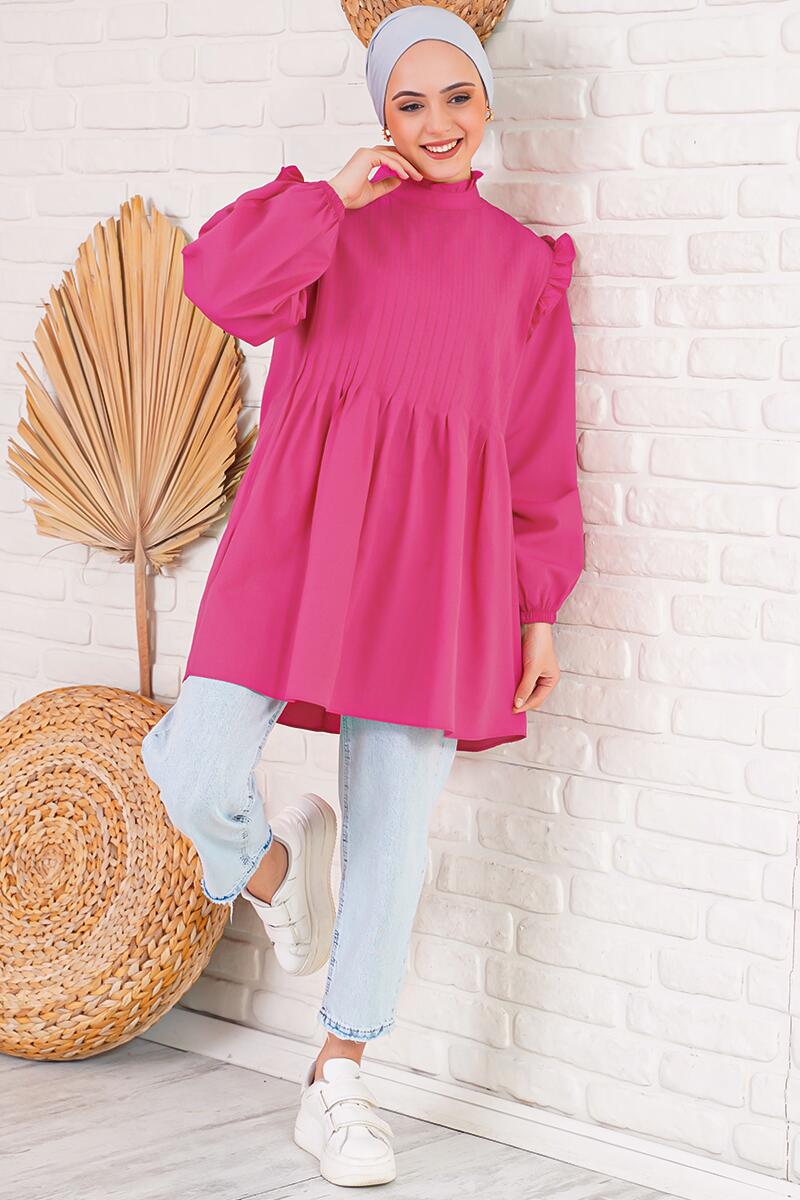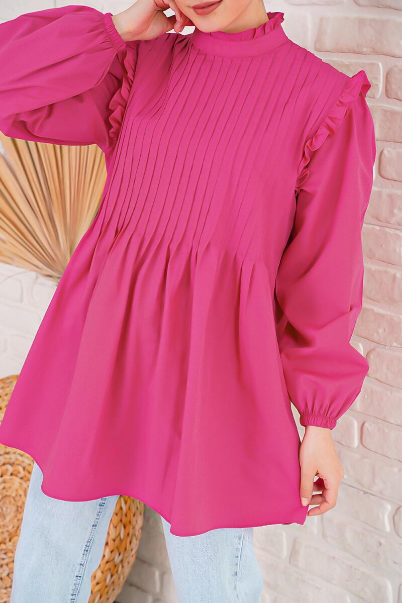 Önünde yer alan pilesiyle hareketlilik kazanan yeni sezon tunik ile dolaba yenilik kat. Omuzları ve boyun kısmı fırfırlıdır. Dik yaka oluşuyla boyun kısmının görünmesini istemeyenler için ideal bir parça. Arkası düğmelidir. Kol ucu lastiklidir.