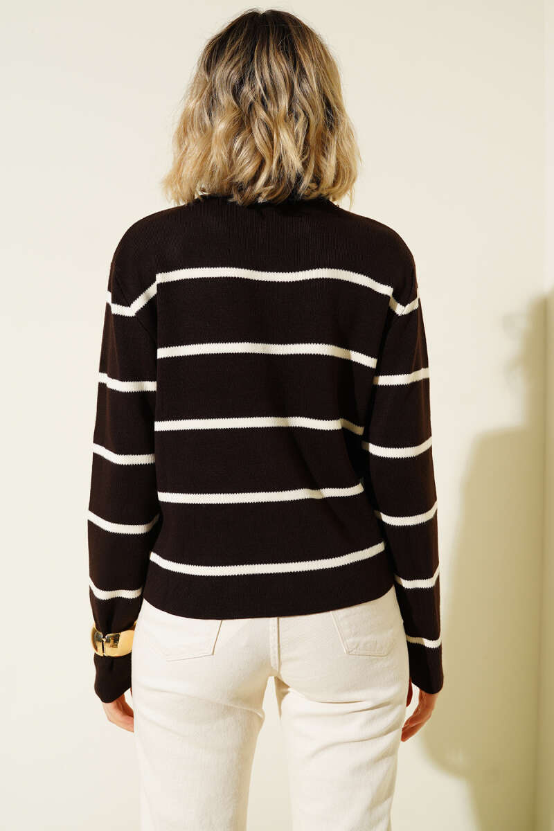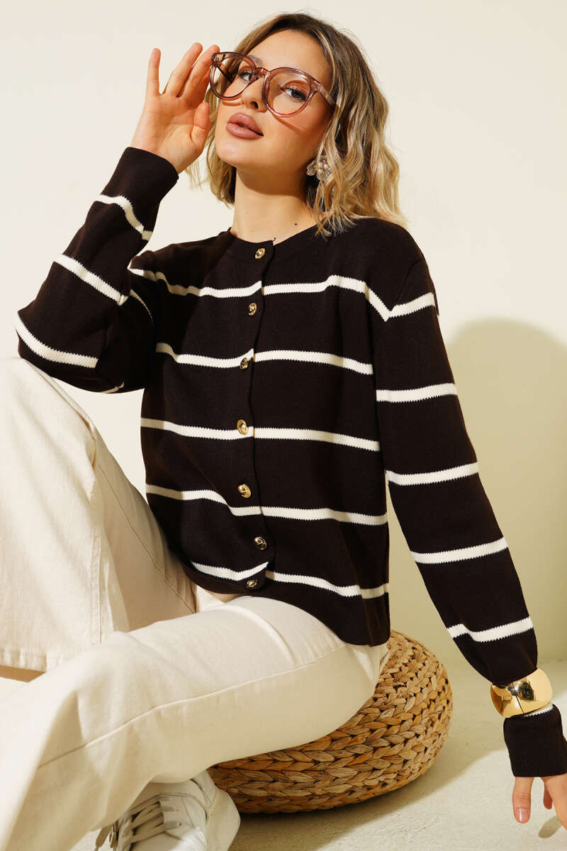 İnce Yatay Çizgili Triko Hırka Kahve