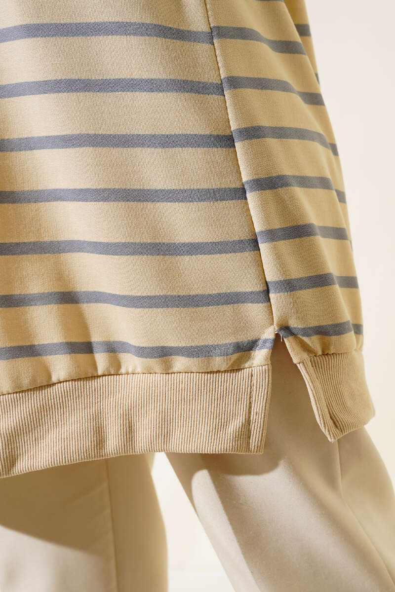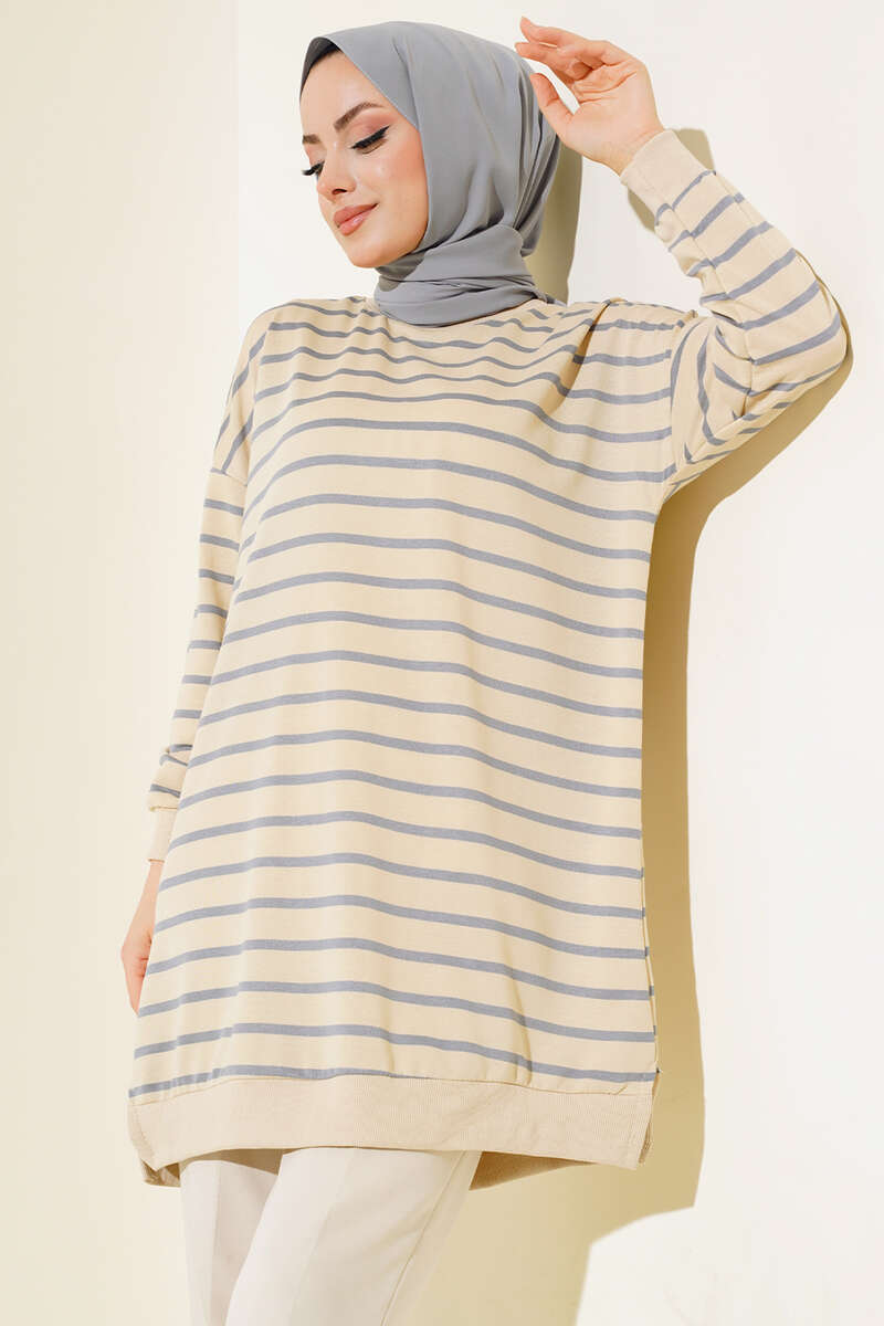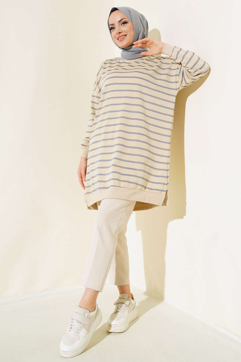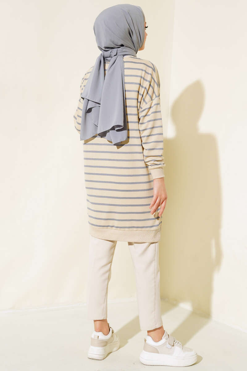 Yeni sezon tuniğimiz ince yatay çizgileriyle sportif bir şıklığa kavuşmuştur. Bisiklet yaka olan tuniğimizin bilekleri ribanalıdır. Etek uçlarında bulunan yırtmaçları tuniğimize hakeret kazandırmıştır.
