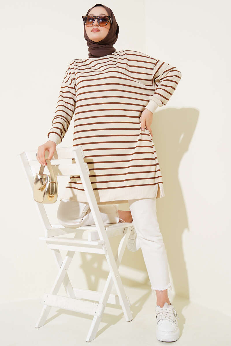 İnce Yatay Çizgili Tunik Kahve