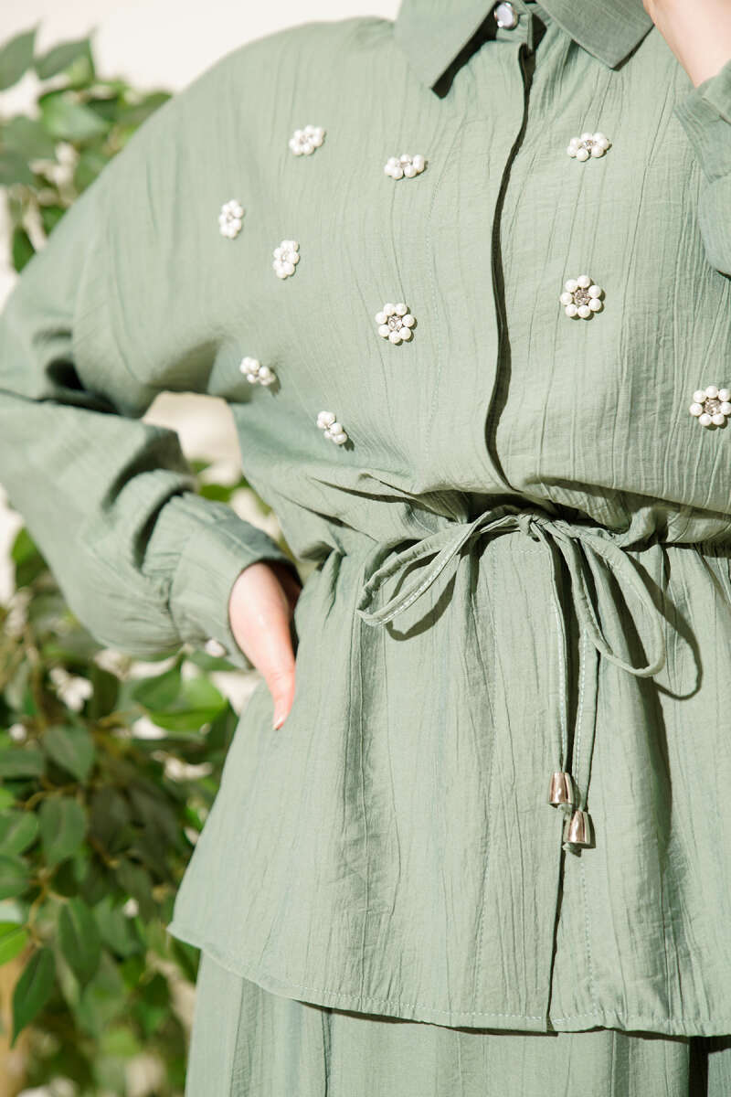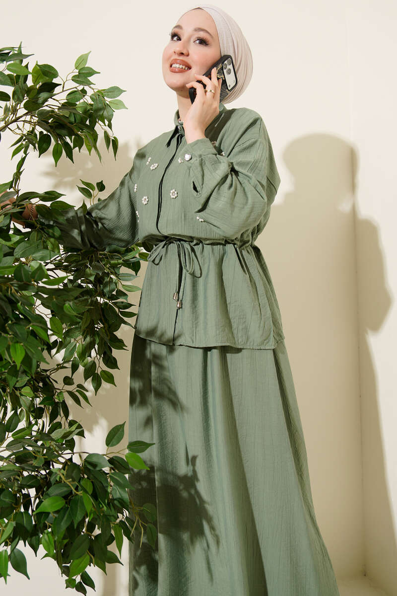 İnci Çiçekli Bel Tünelli Etekli Takım Çağla Yeşili