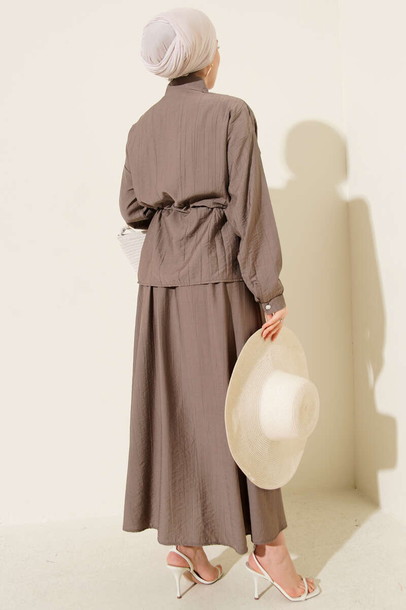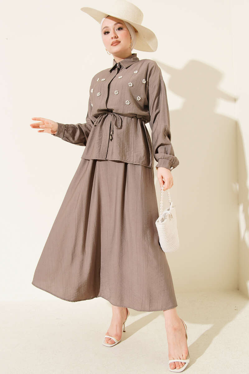 İnci Çiçekli Bel Tünelli Etekli Takım Vizon