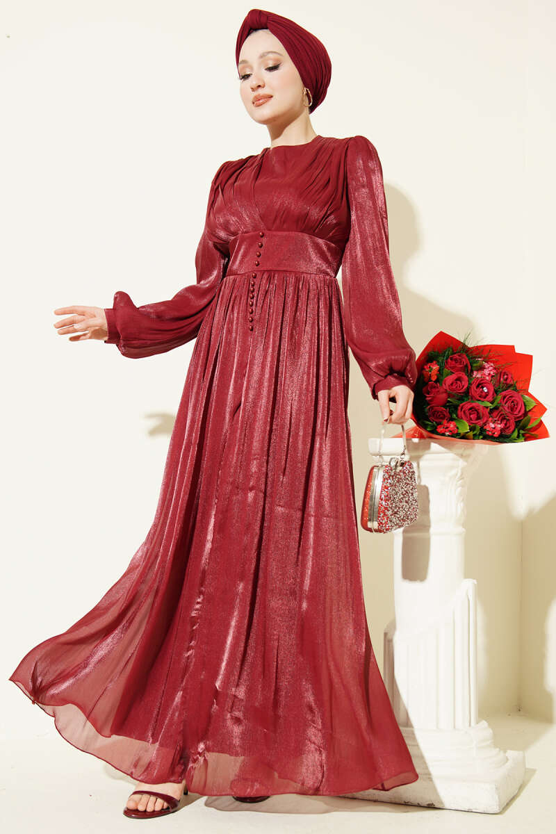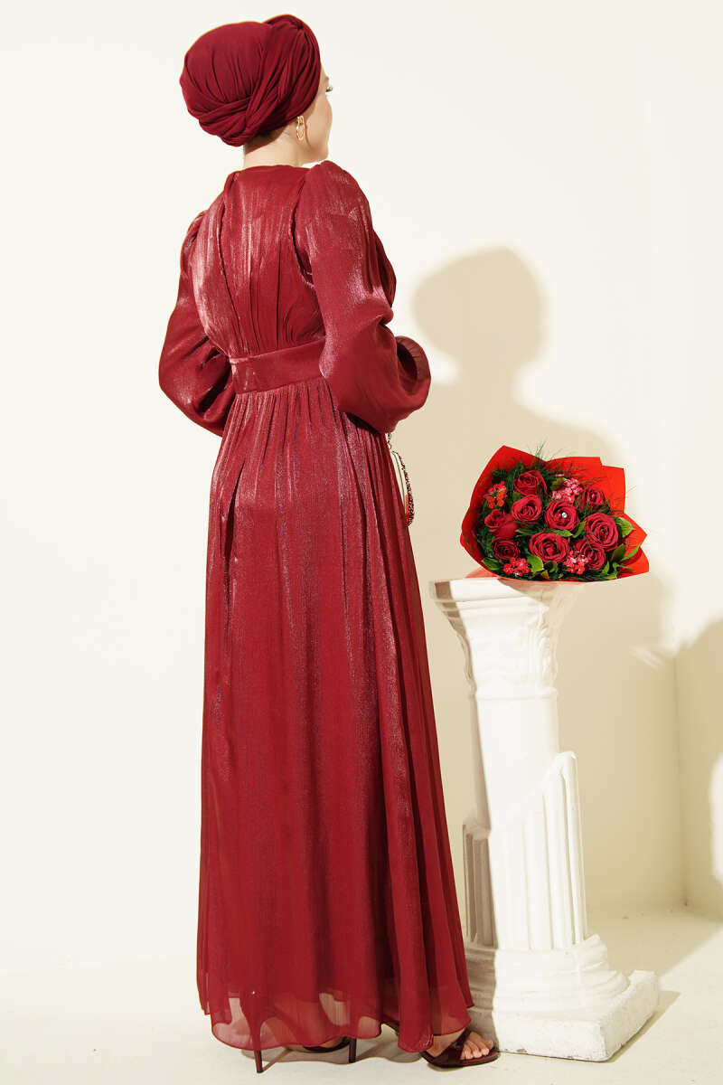 İnci Detaylı Drapeli Abiye Elbise Bordo