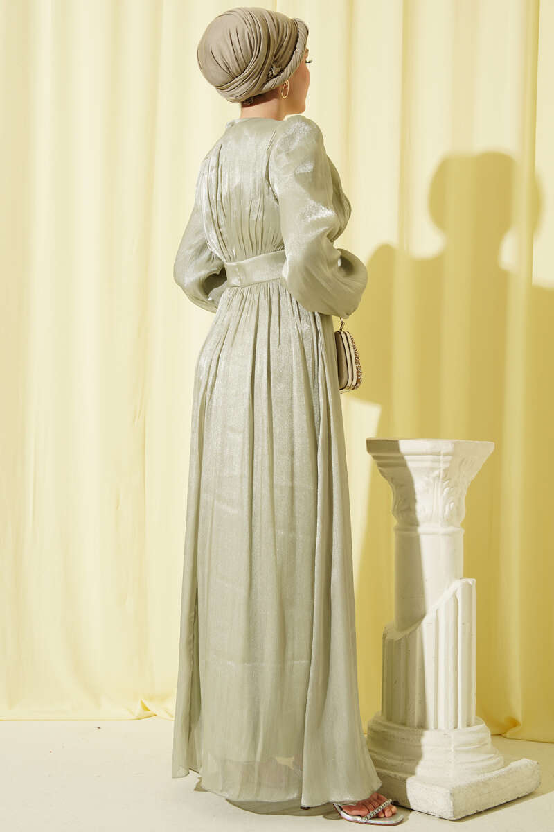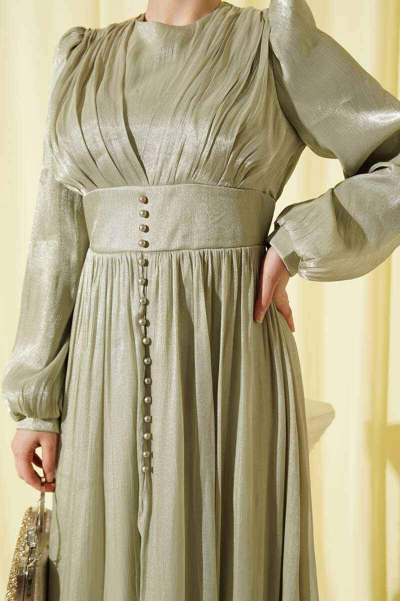 İnci Detaylı Drapeli Abiye Elbise Çağla Yeşili