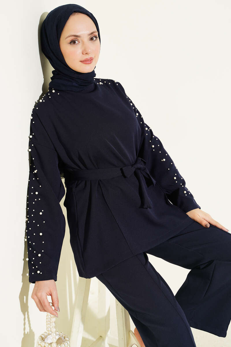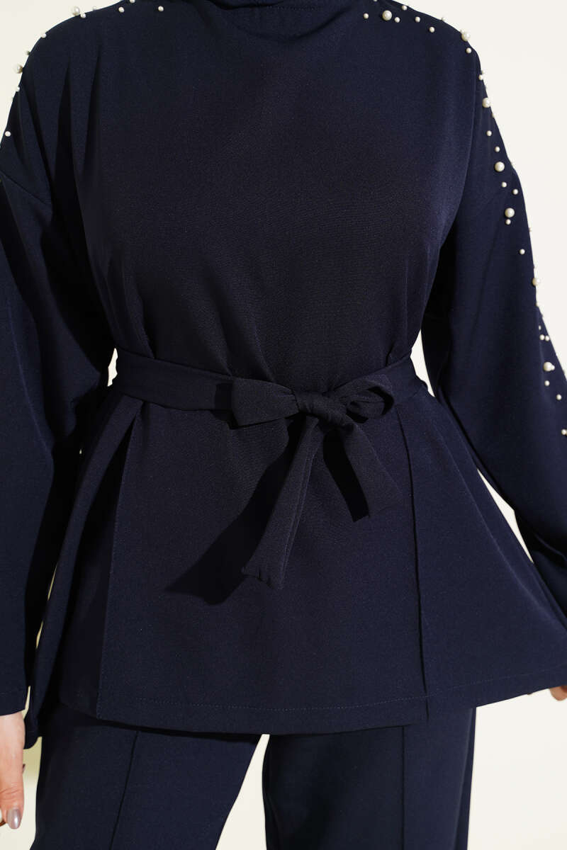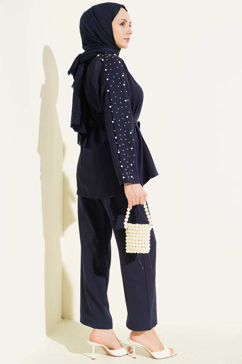 İnci Detaylı Kuşaklı İkili Takım Lacivert