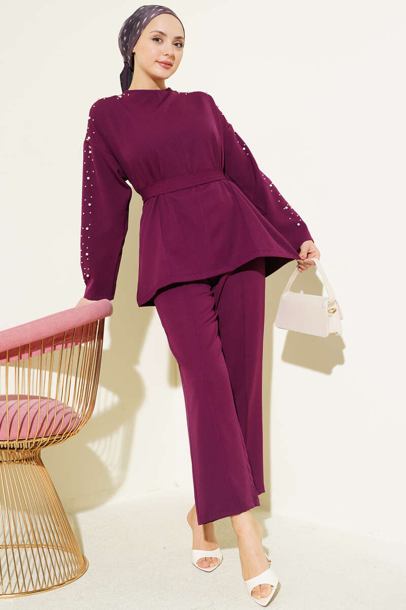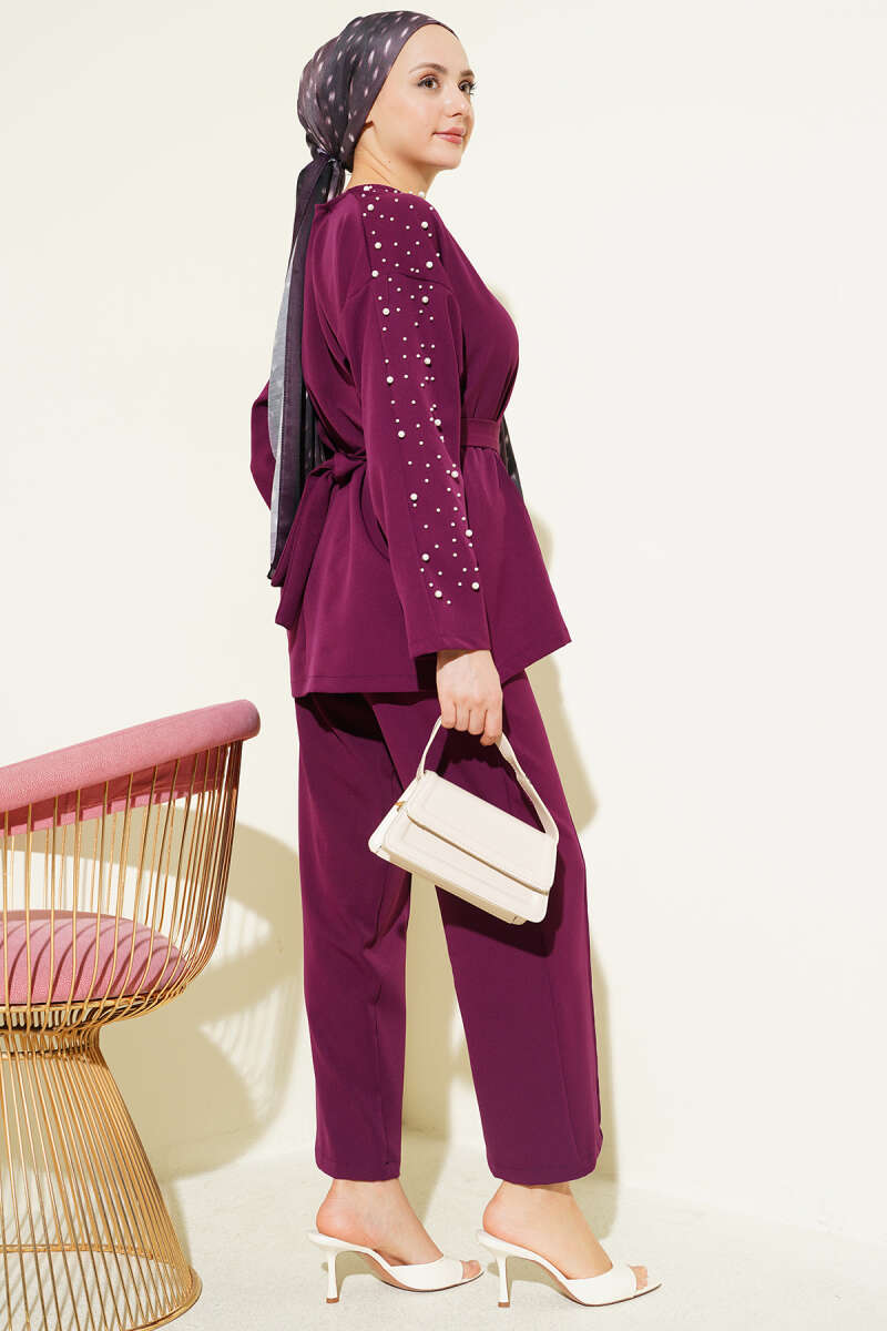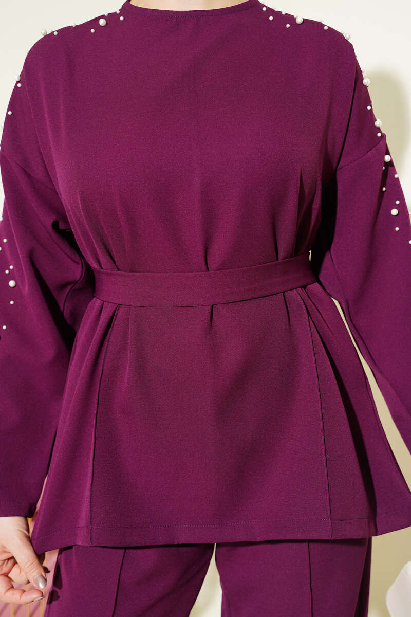 İnci Detaylı Kuşaklı İkili Takım Mor