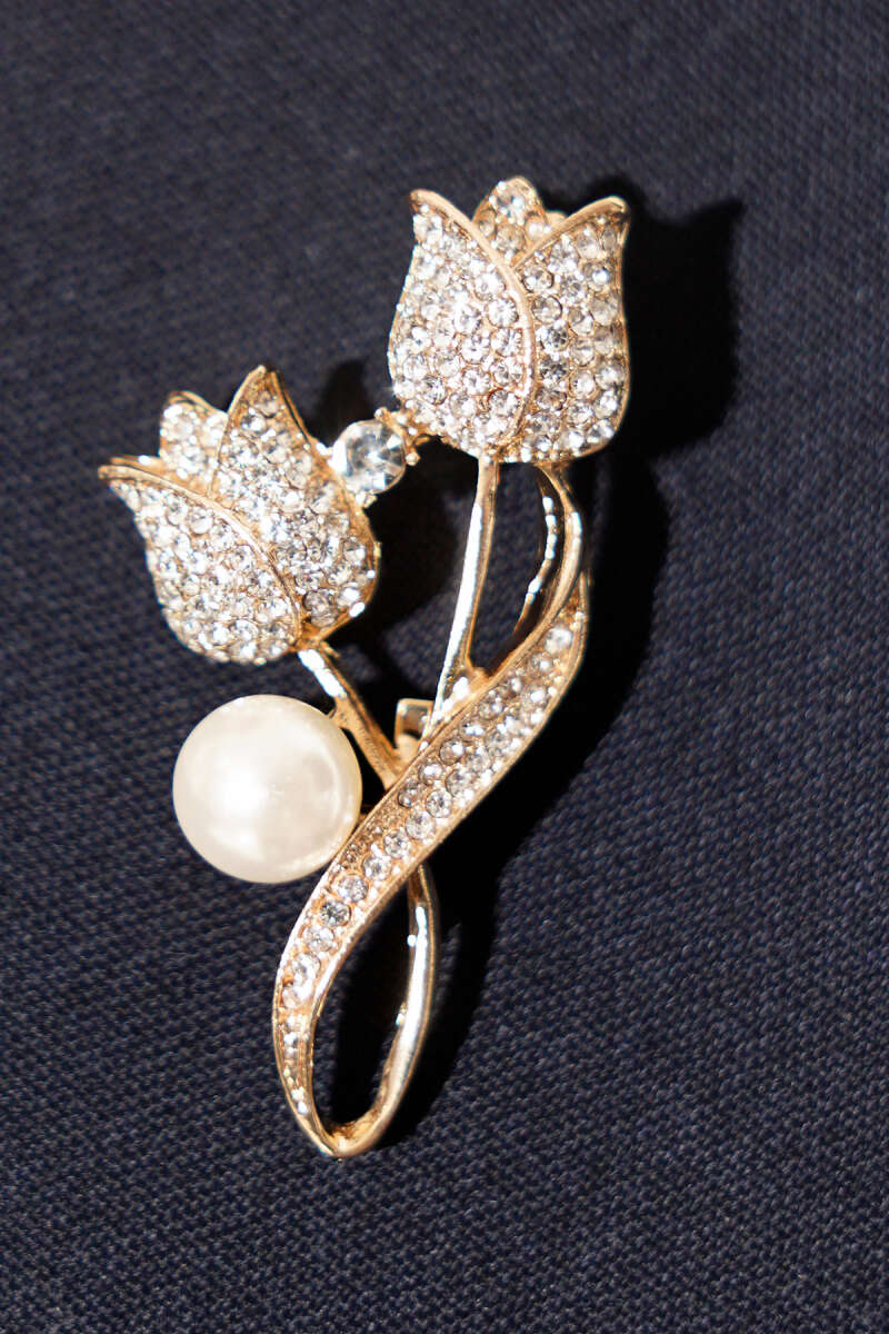 İnci Detaylı Lale Figürlü Taşlı Broş Gold