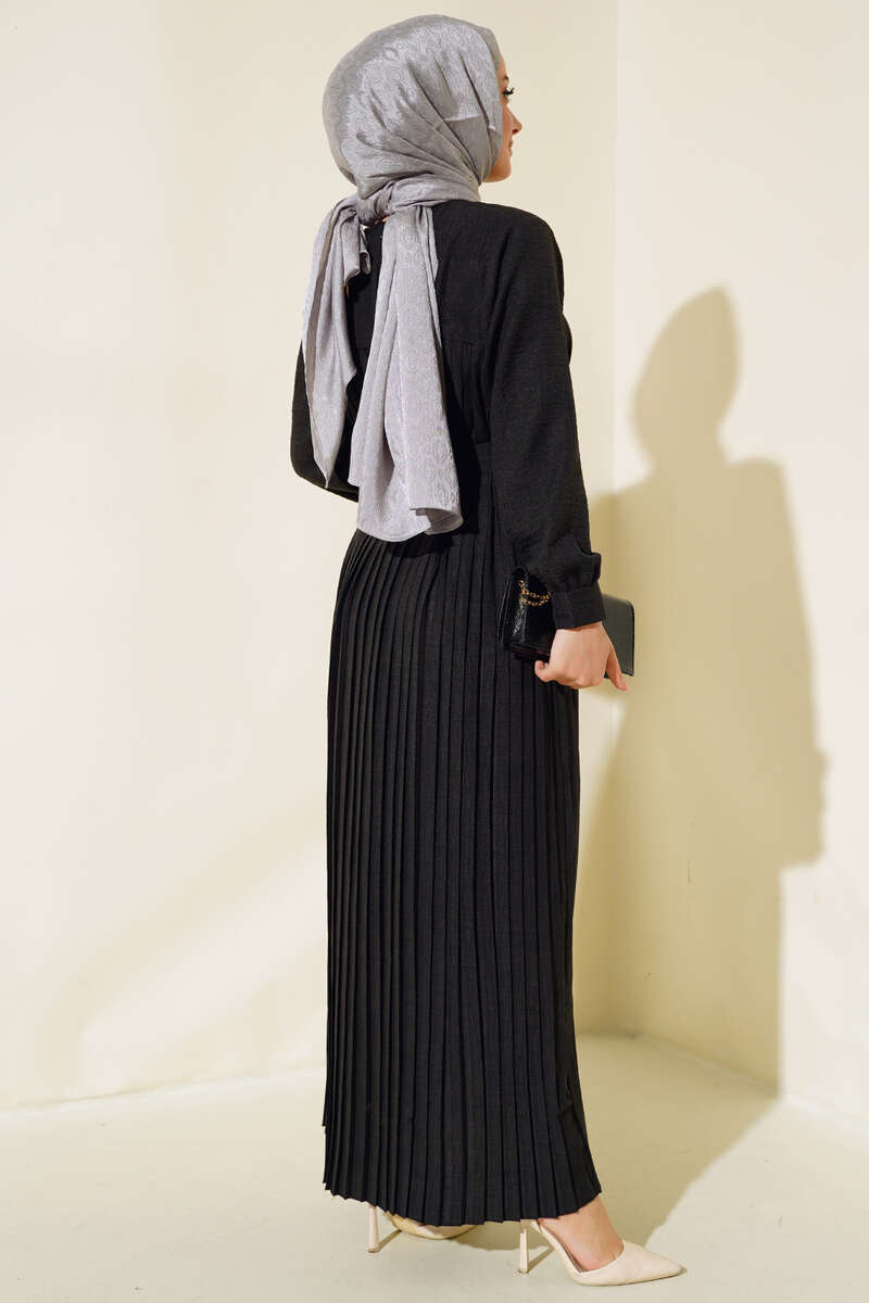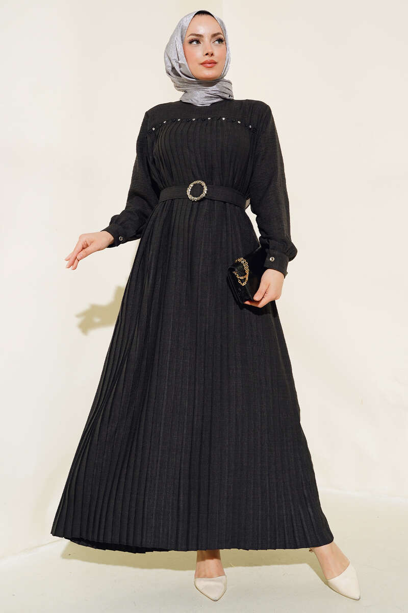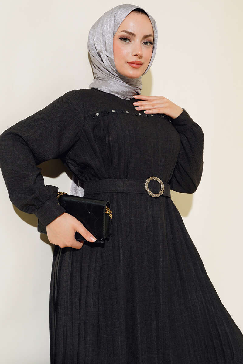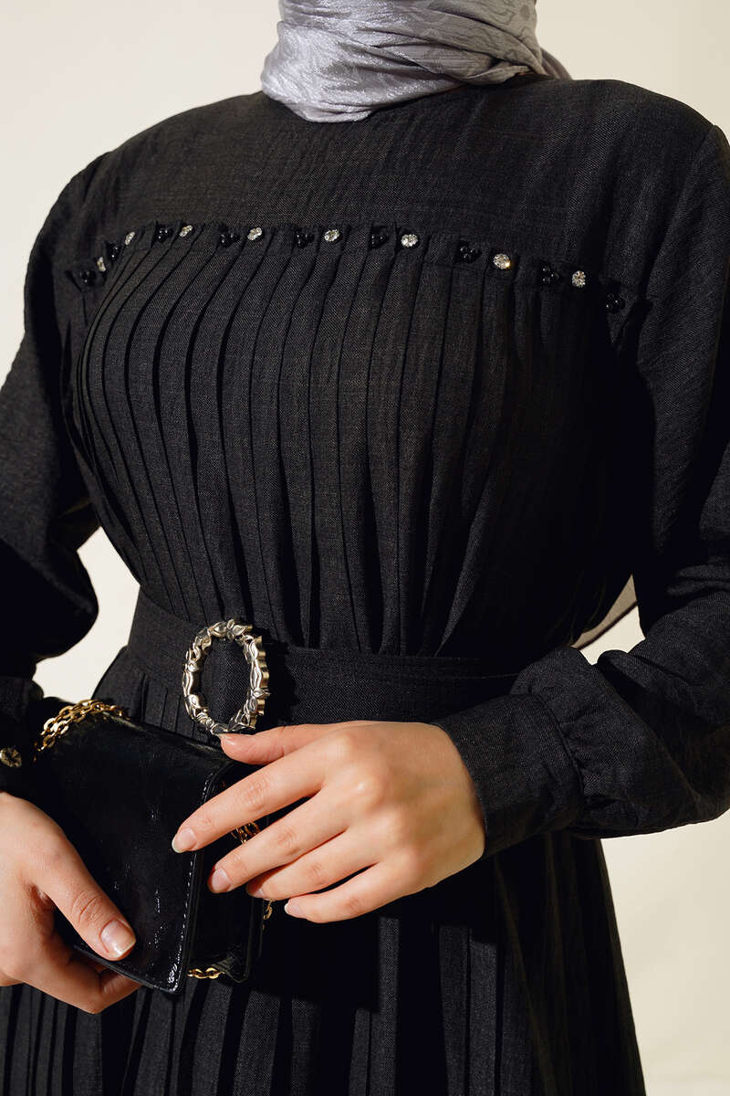 İnci Detaylı Pileli Elbise Siyah