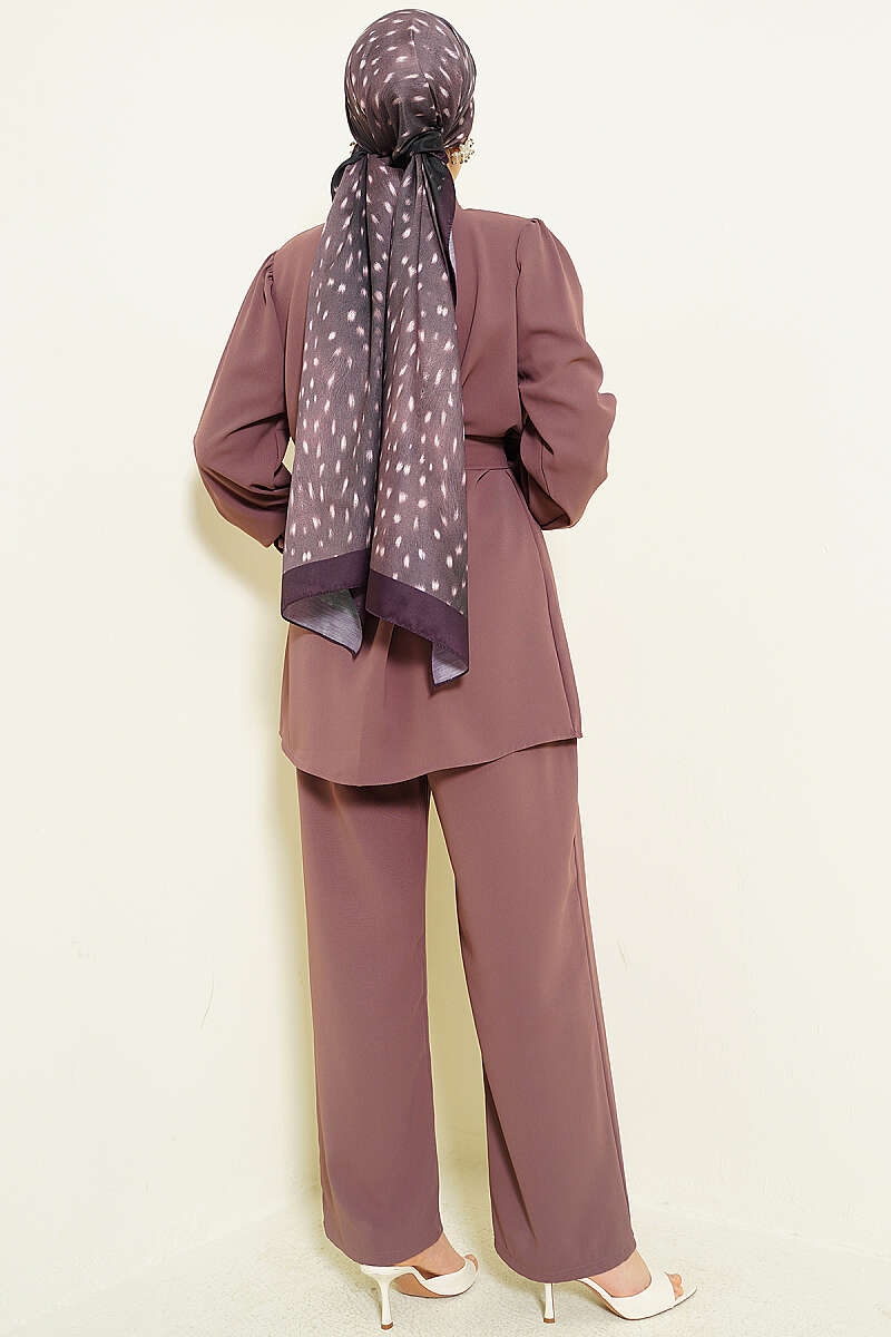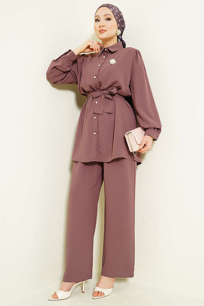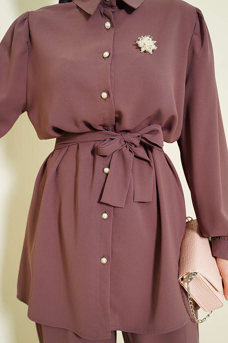 İnci Düğme Detaylı Kuşaklı İkili Takım Magenta