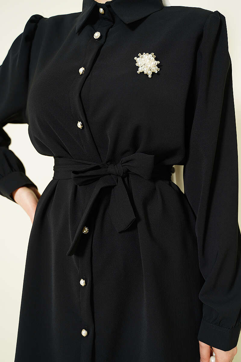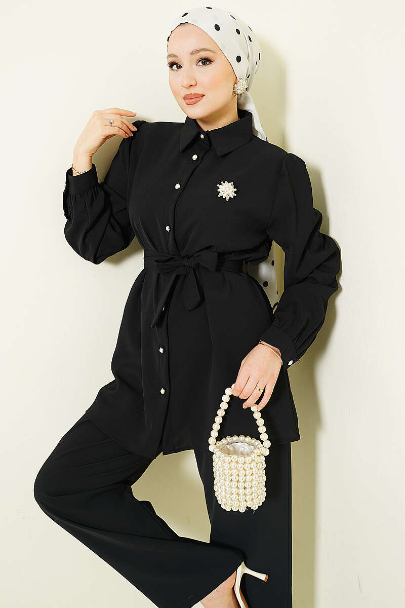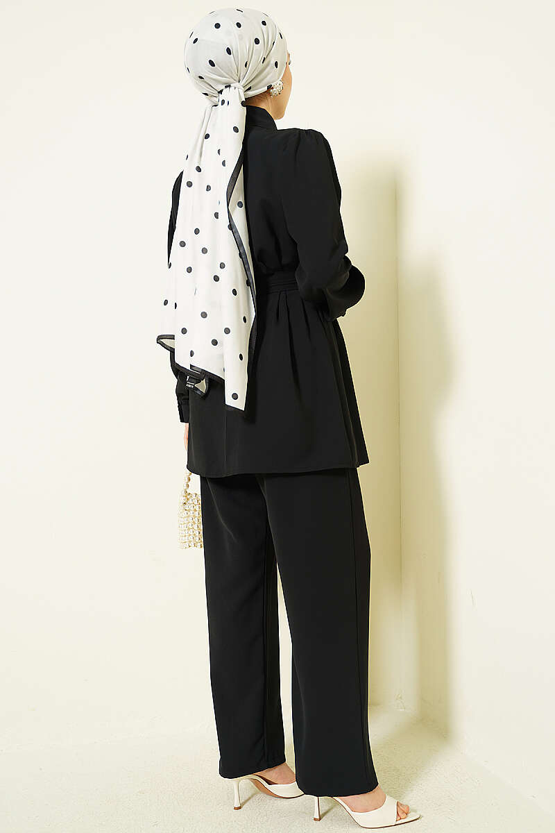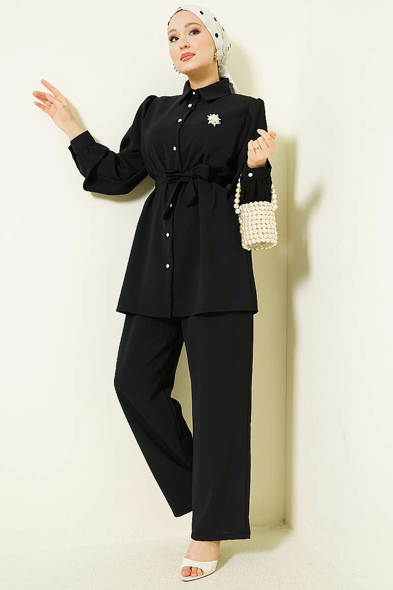 İnci Düğme Detaylı Kuşaklı İkili Takım Siyah