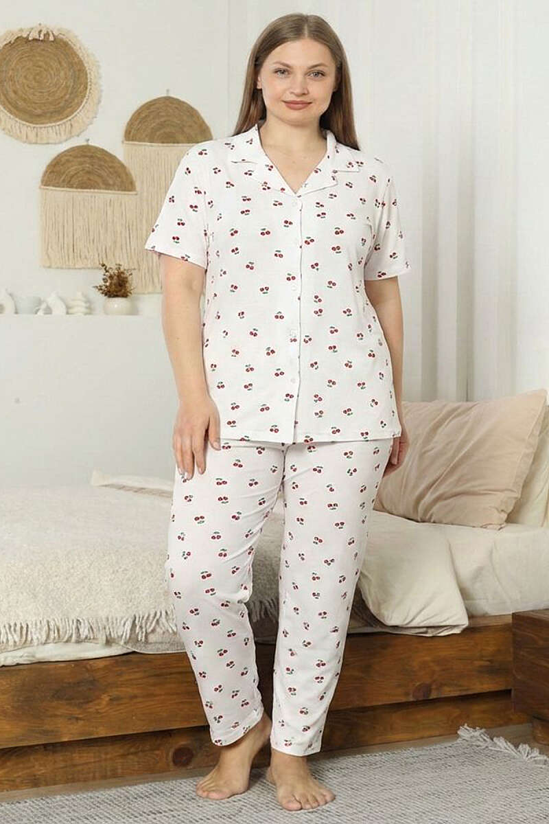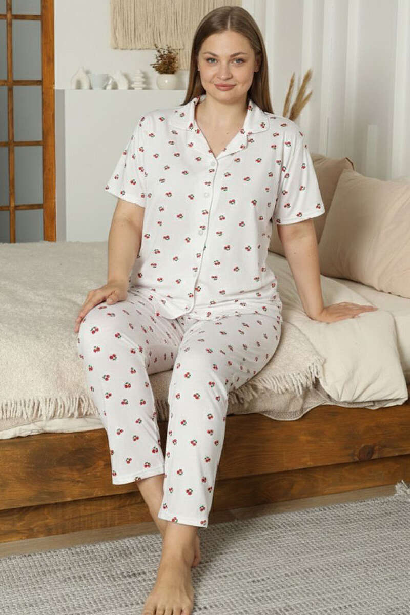 İnci Düğmeli Kirazlı Büyük Beden Pijama Takımı Beyaz
