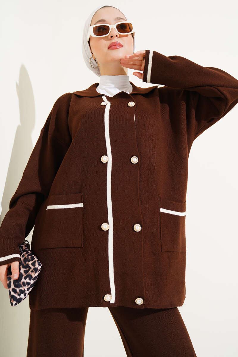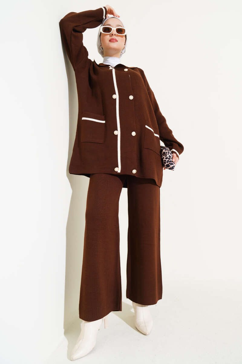 Taşlı Baklava Desen Triko İkili Takım Kahve