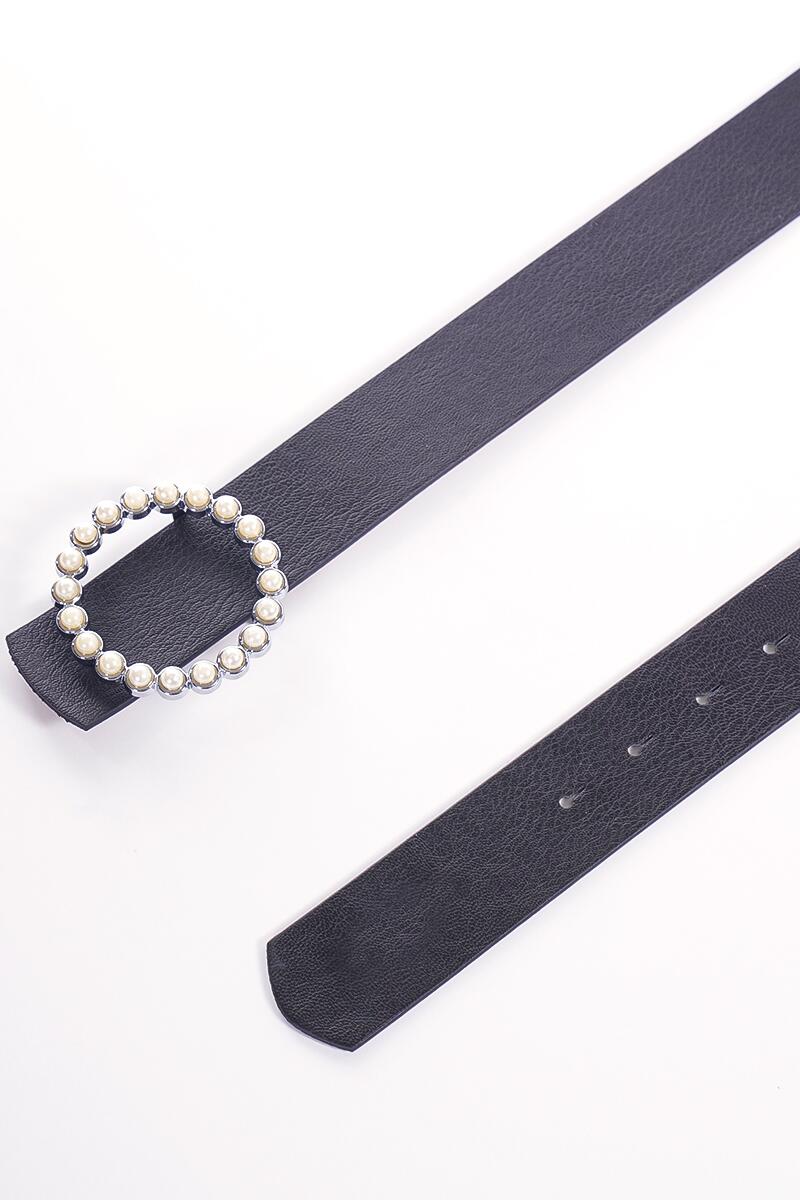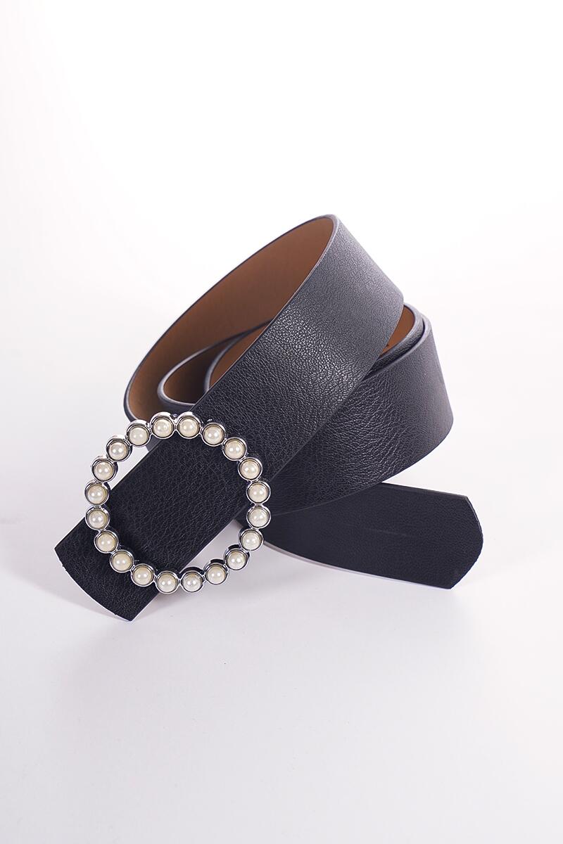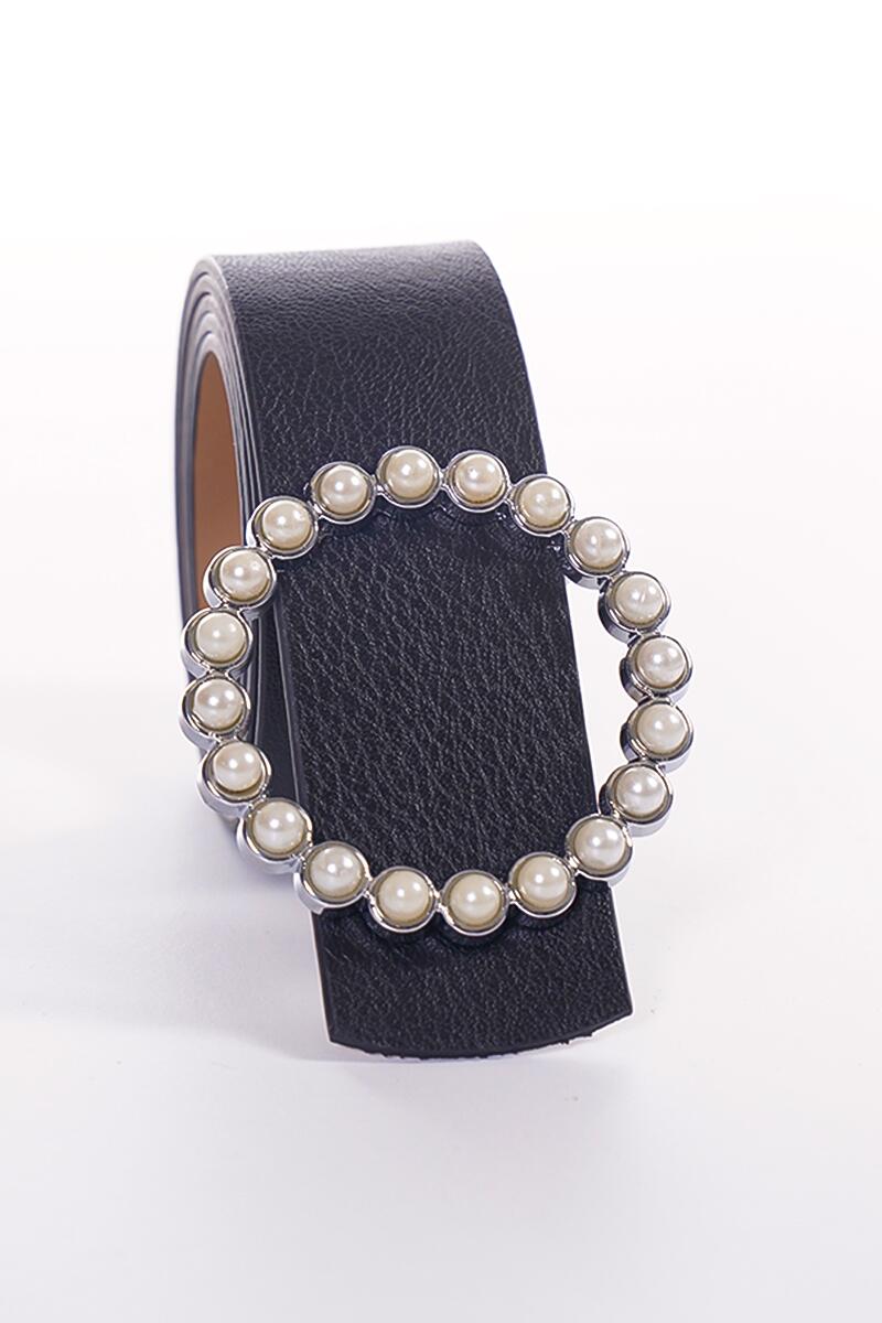 İnci Halka Tokalı Siyah Gümüş Kemer