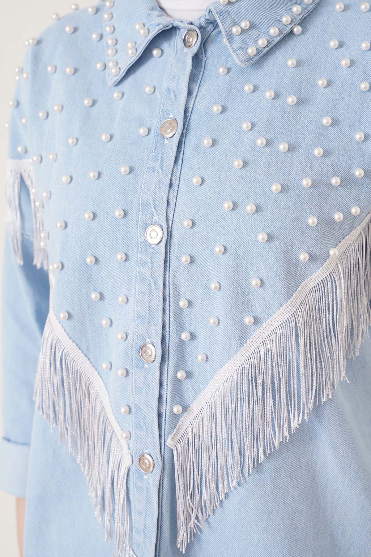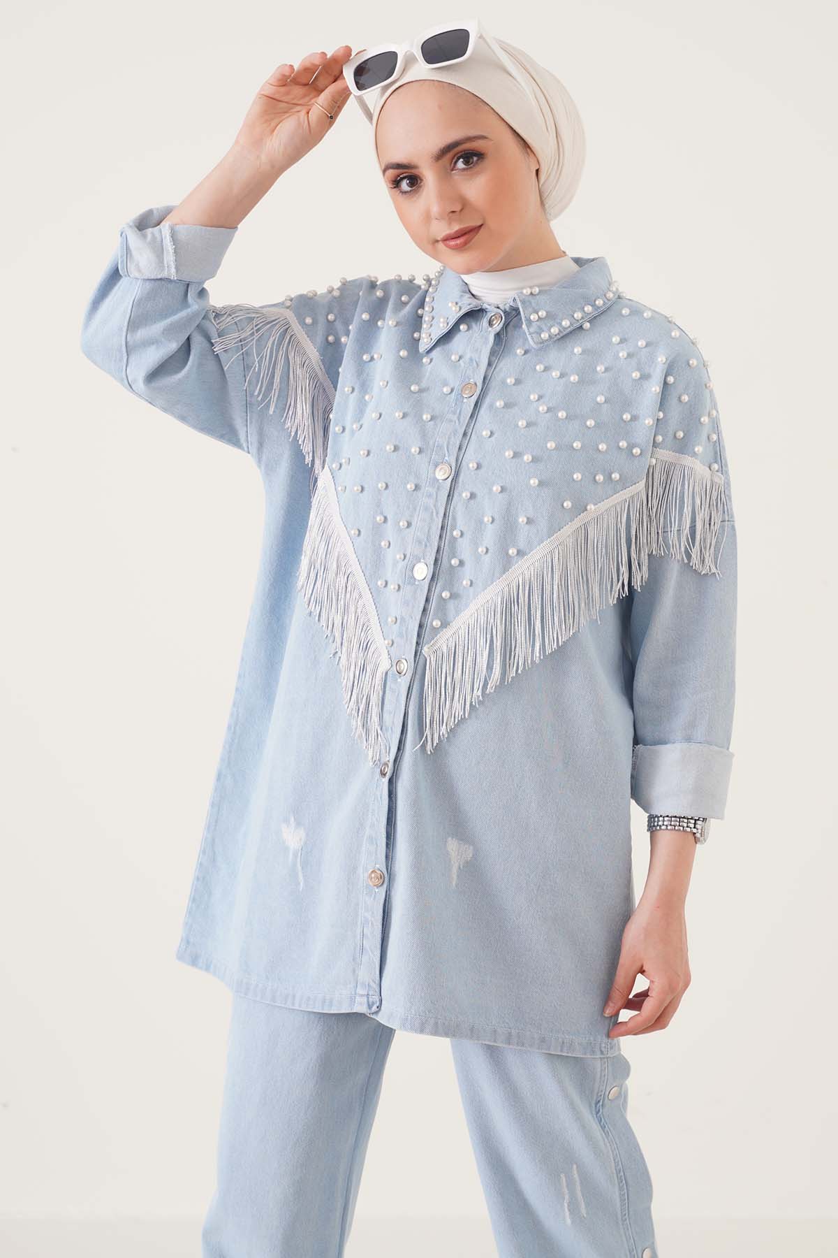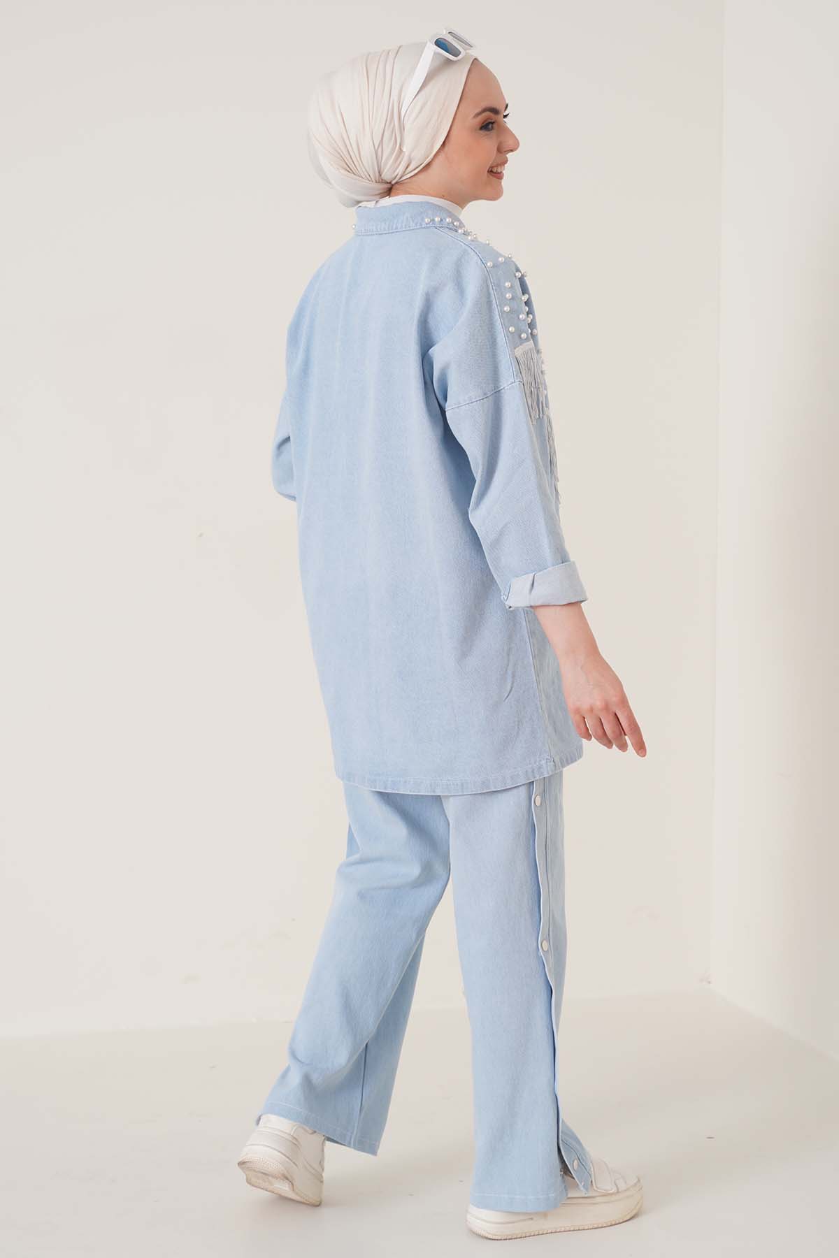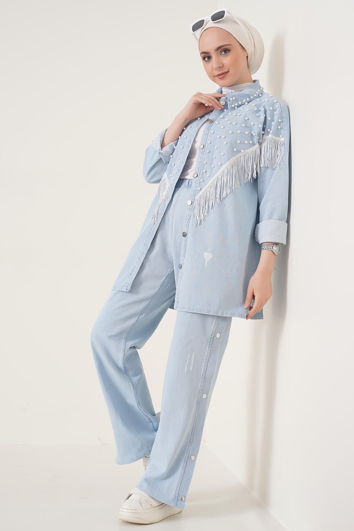 Kadın giyimde kurtarıcı parçaların başında gelen takımlar sizinle. Ceketinde inci işlemeleri ve püskül detayları bulunmaktadır ve boydan düğmelidir. Pantolonun beli lastikli olup cepsizdir yan tarafında düğme detayları bulunmaktadır. Paçada ki tek düğme hariç diğer düğmeler aktif değildir.