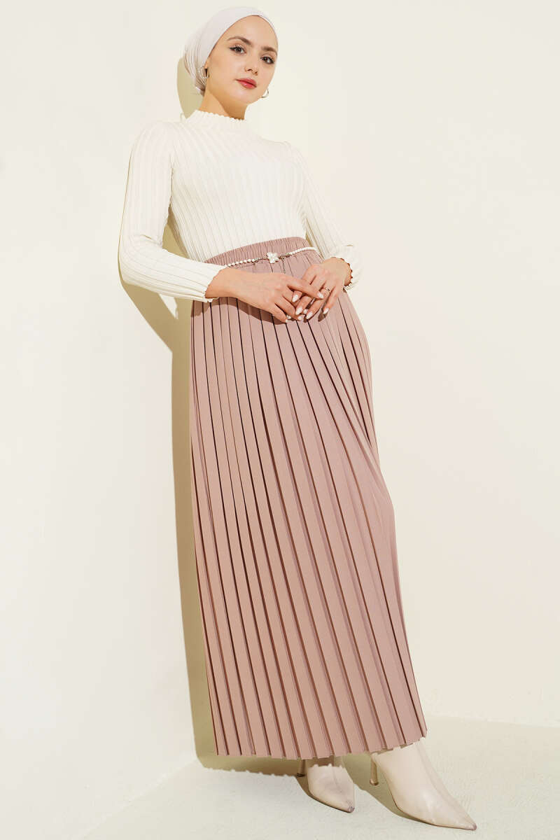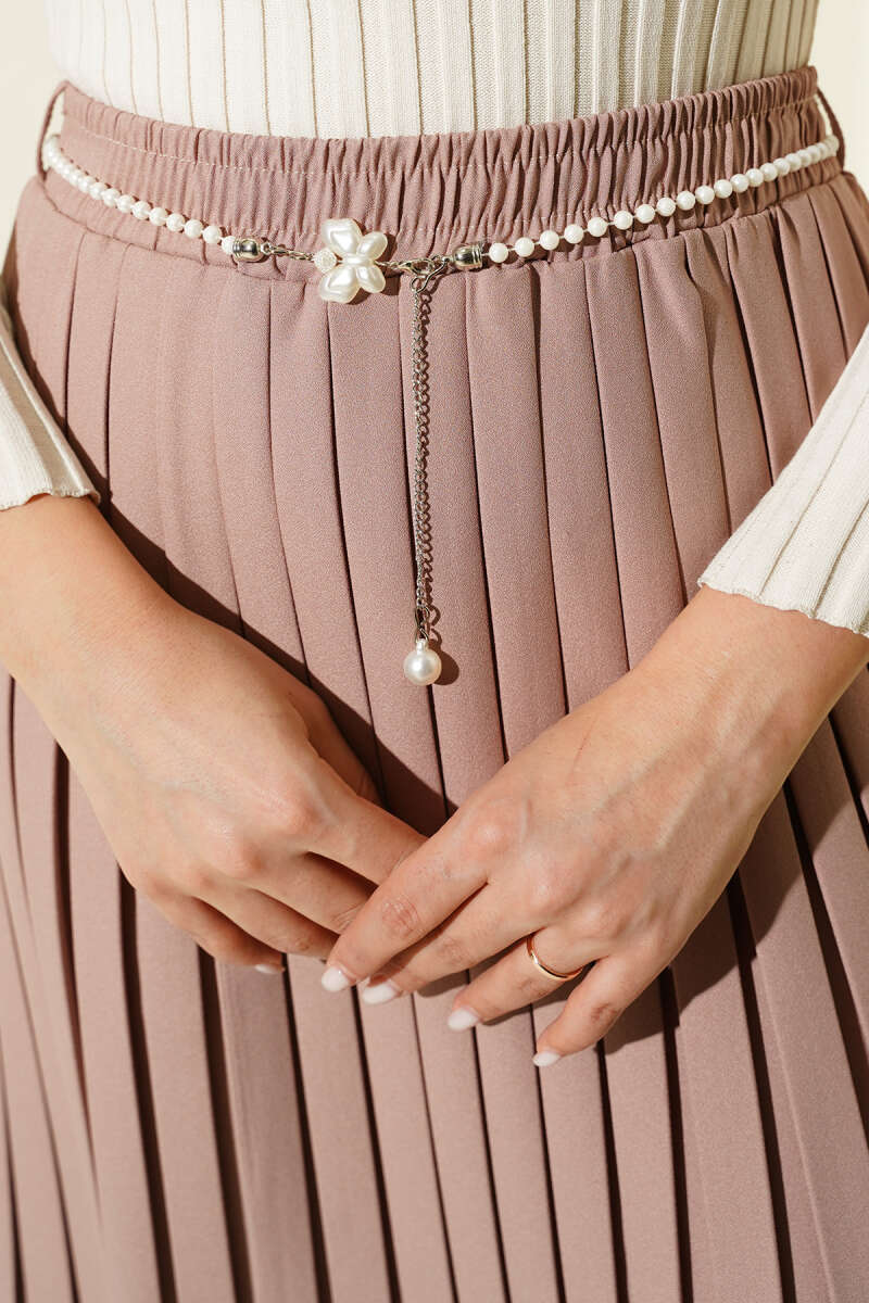 Kemerli Pile Detaylı Cepli Etek Bordo