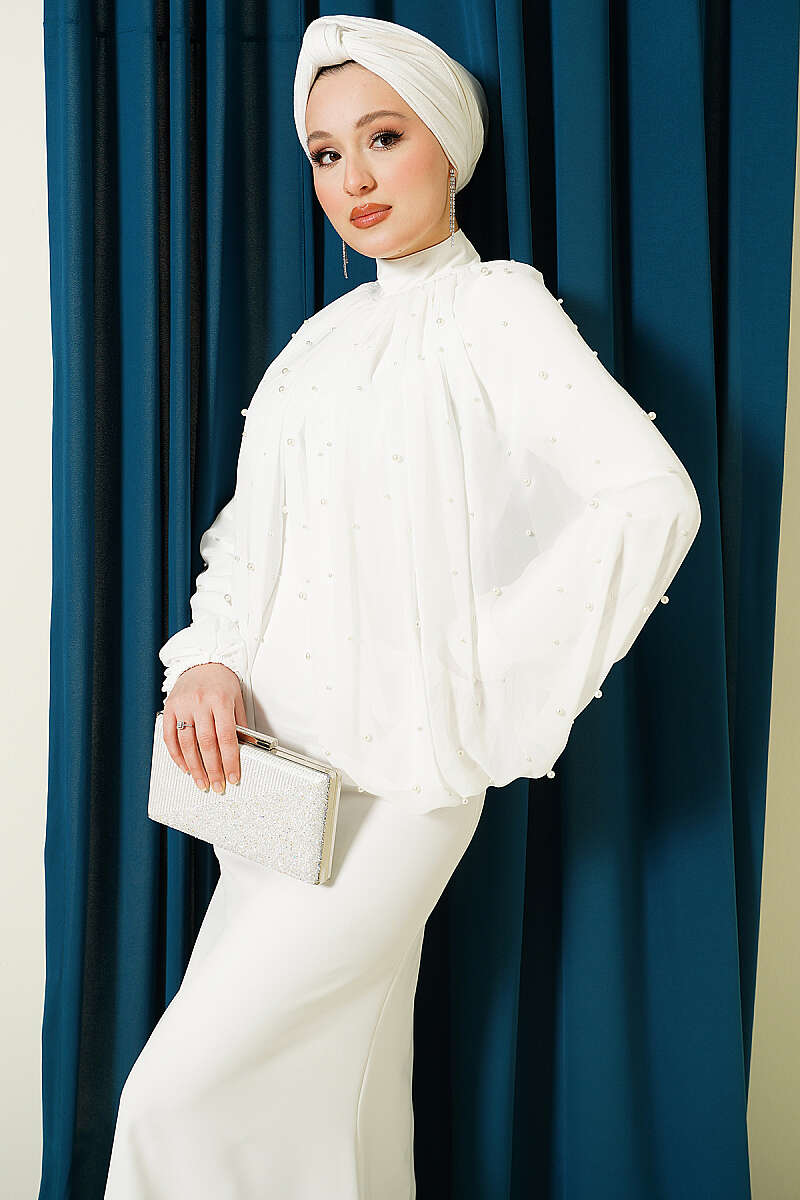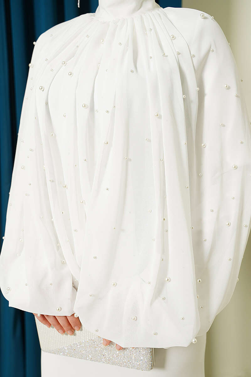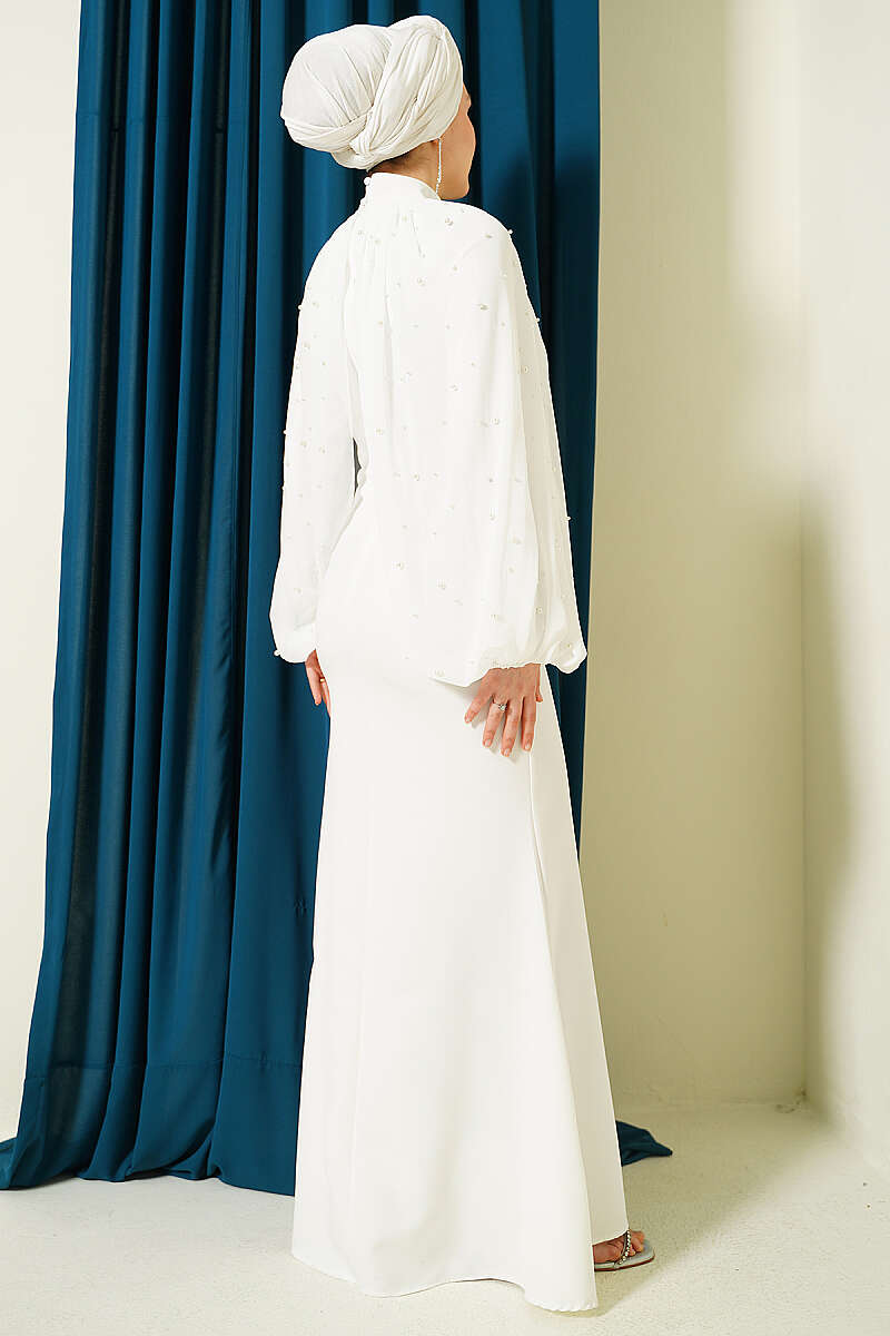 İnci Pelerinli Abiye Elbise Ekru
