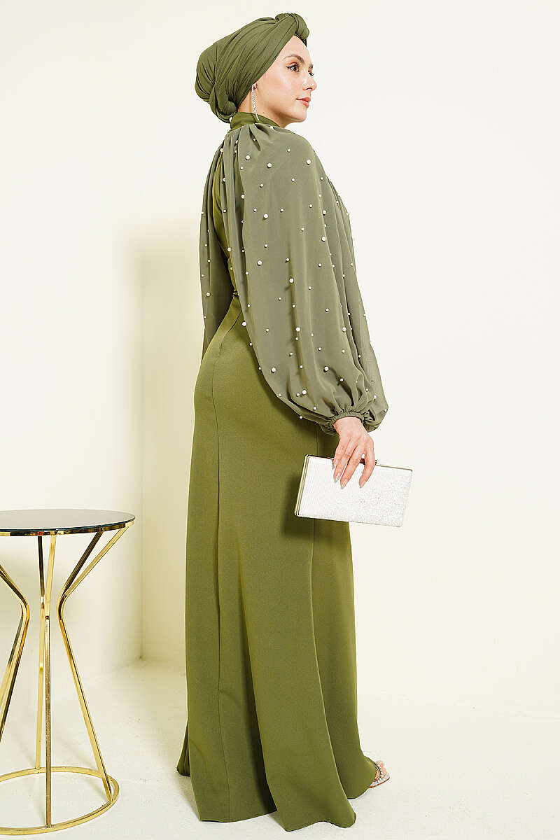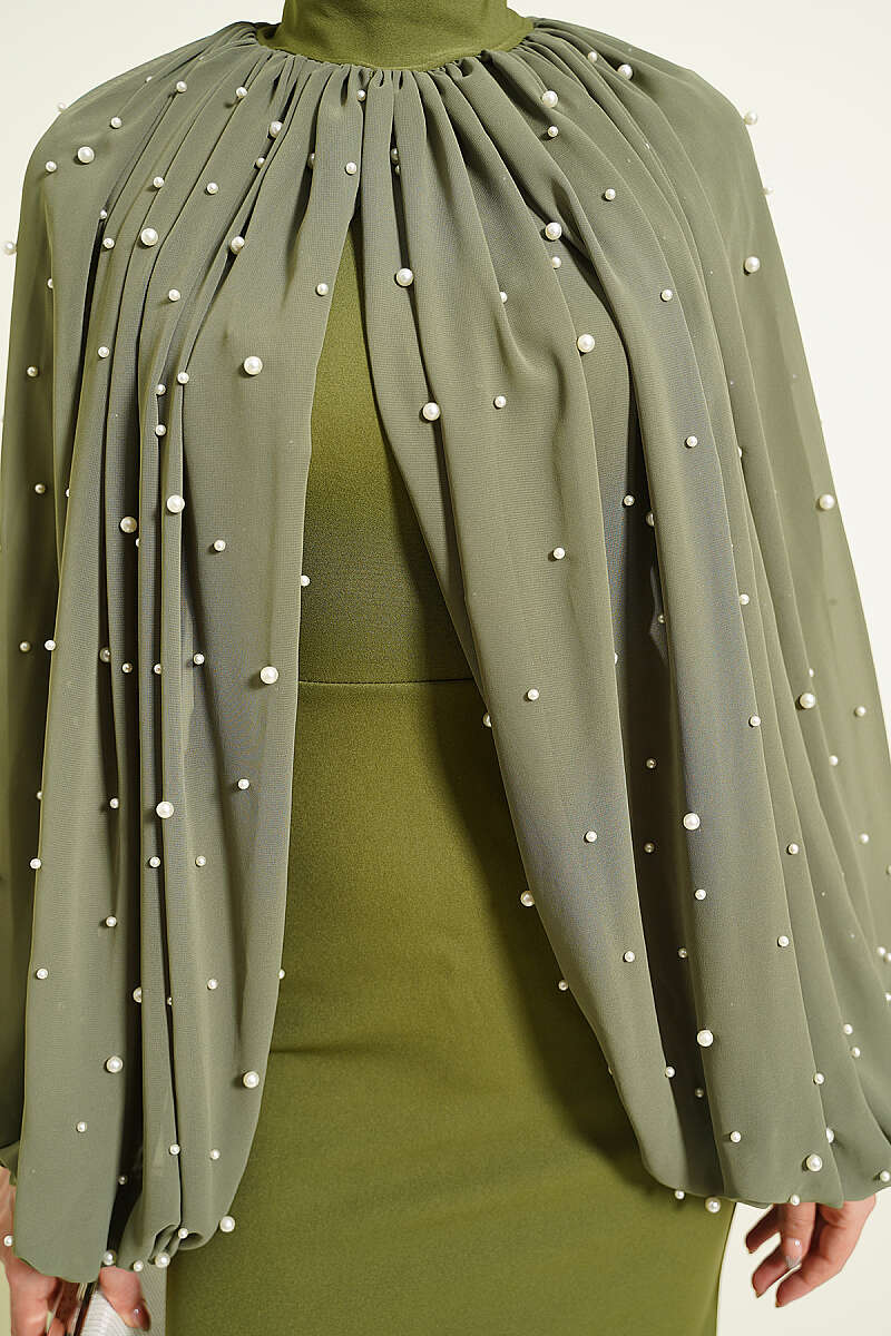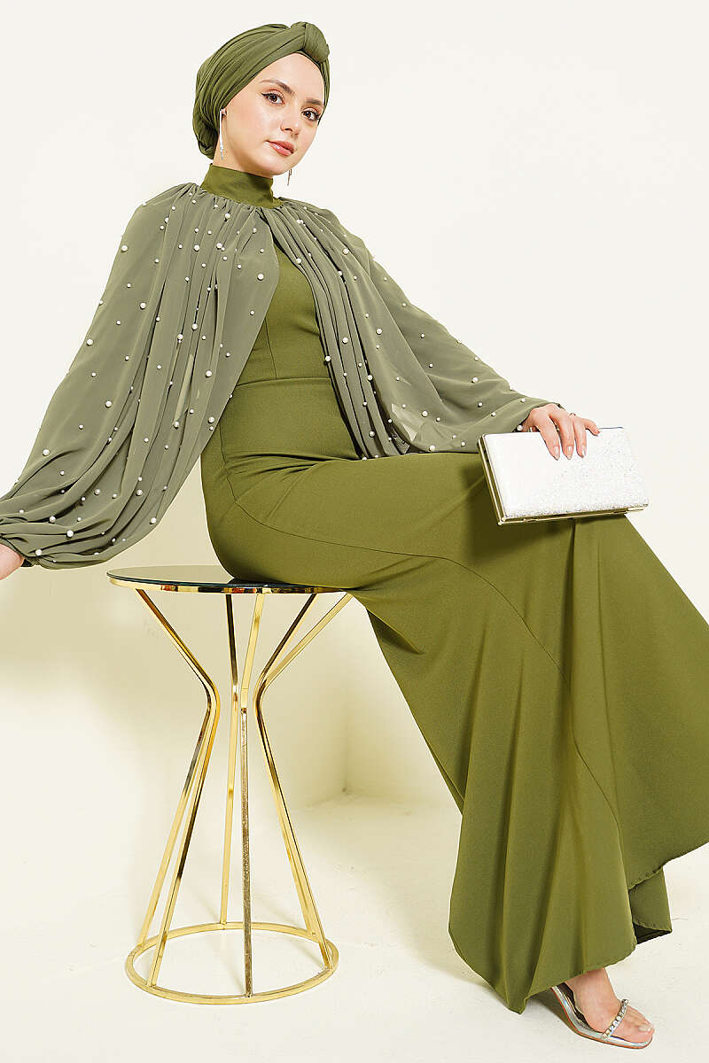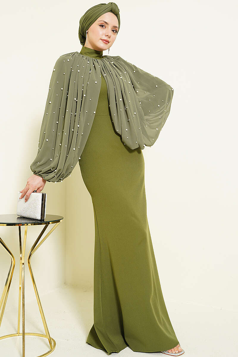 İnci Pelerinli Abiye Elbise Haki