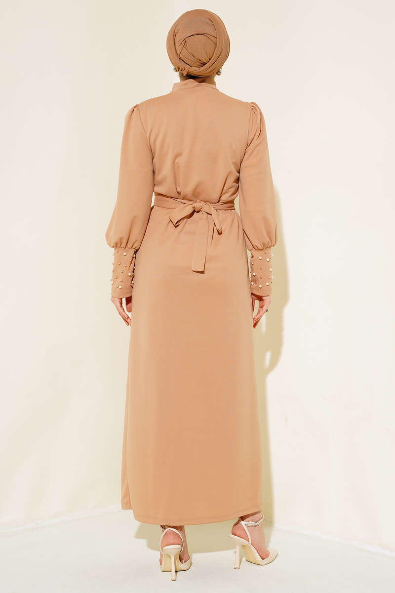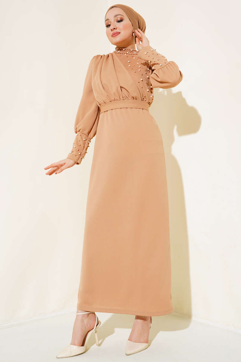 Yeni sezon elbisemiz harika görünümüyle sizler için geldi. Elbisemizin önü, yakası ve bilekleri inci süslemelidir. Dik yakadır. Kuşağı bulunmaktadır. Her ortamda dikkatleri üzerinize çekiceksiniz. Farklı renkleri mevcuttur.
