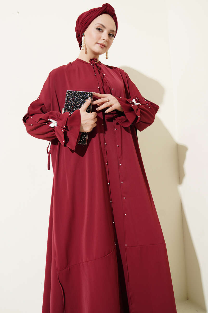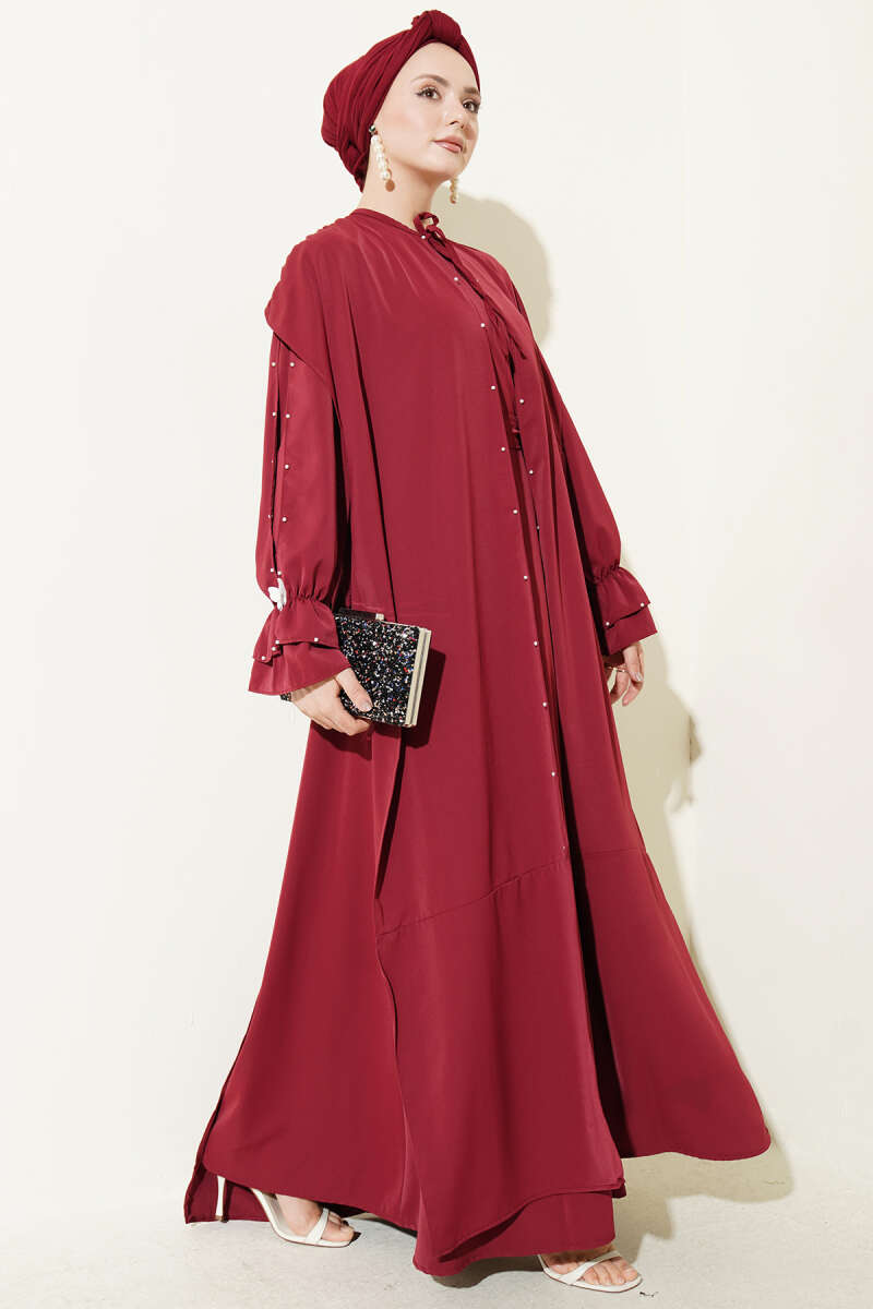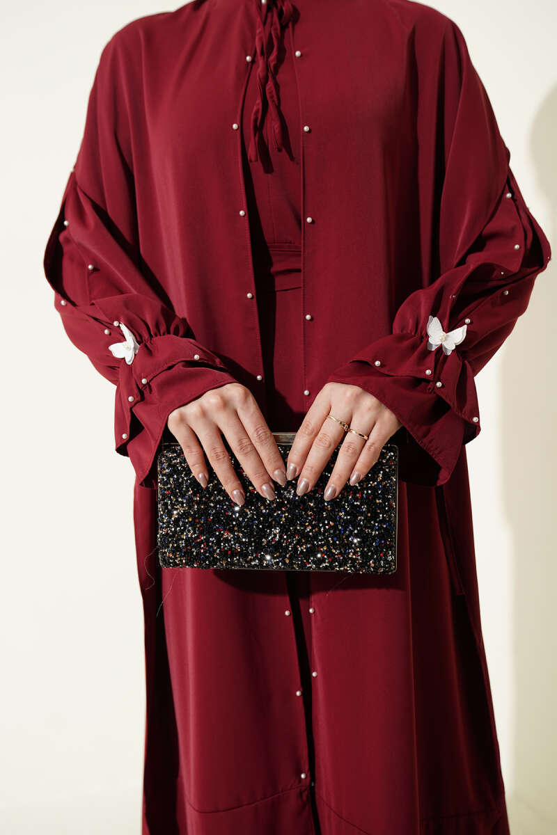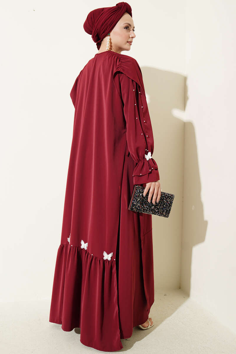 Omuzlardan dökülen pelerin detayı ve üzerindeki zarif kelebek motifleriyle masalsı bir şıklık sunan bu elbise, özel davetlerin en dikkat çekici parçalarından biridir. İnce işçilikle yerleştirilen inci süslemeleri tasarıma asil bir ışıltı katarken, akışkan kumaş dokusu her adımda zarif bir silüet oluşturur. Belden aşağıya doğru süzülen dökümlü kesimi ve feminen detayları, konforu ve yüksek moda anlayışını bir arada sunar. Modern pelerin tasarımıyla sofistike bir duruş sergileyen bu özel parça, zarafetini özgün detaylarla tamamlamak isteyenler için mükemmel bir seçimdir.