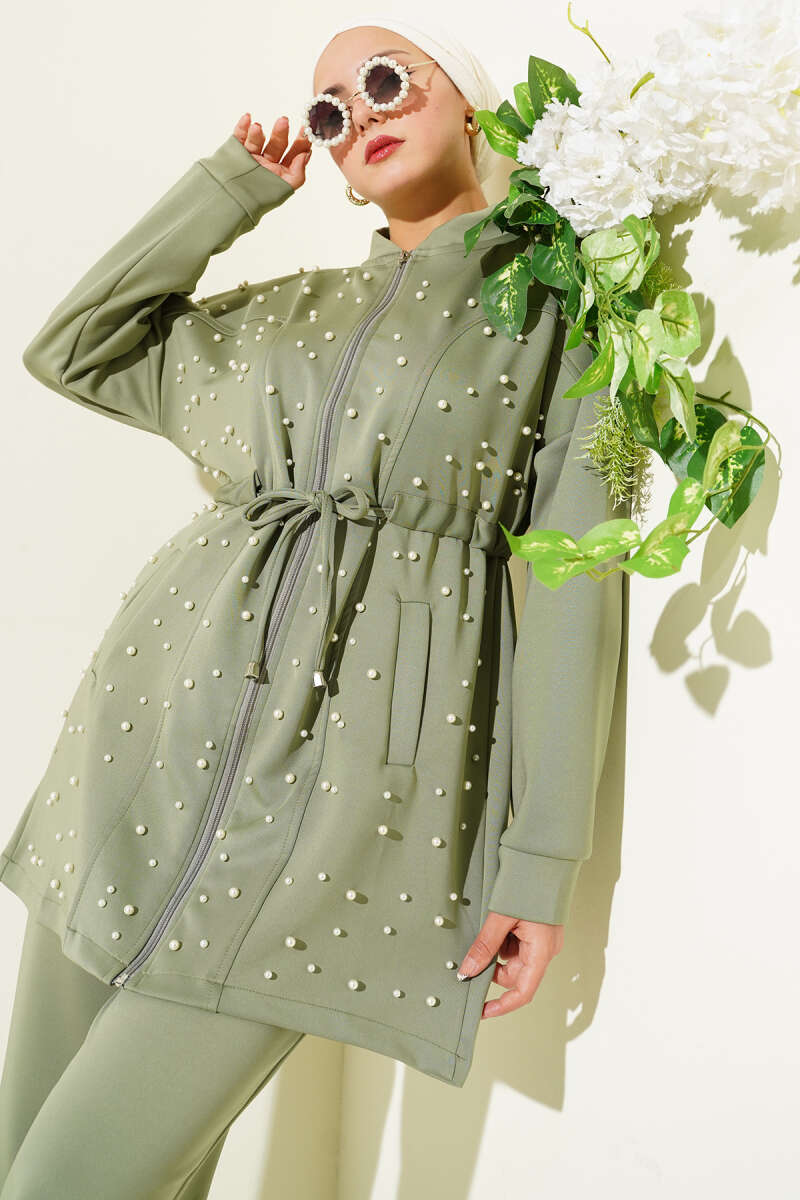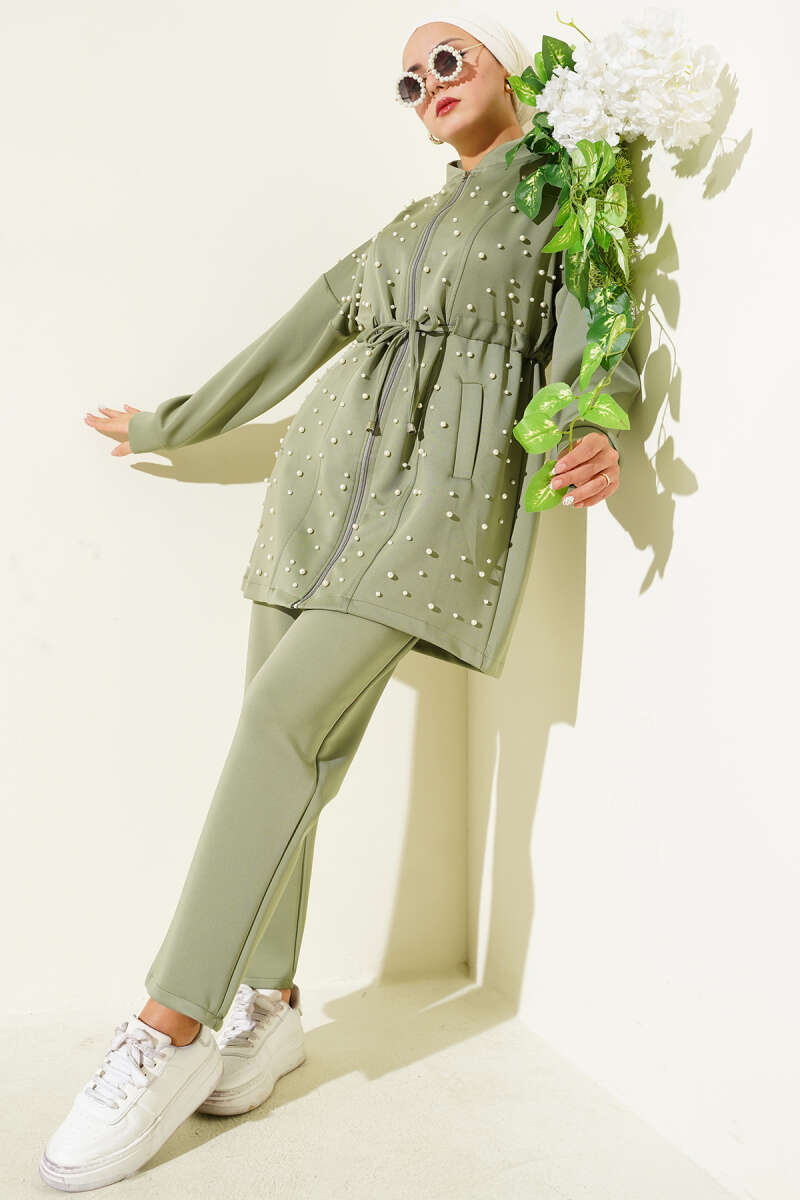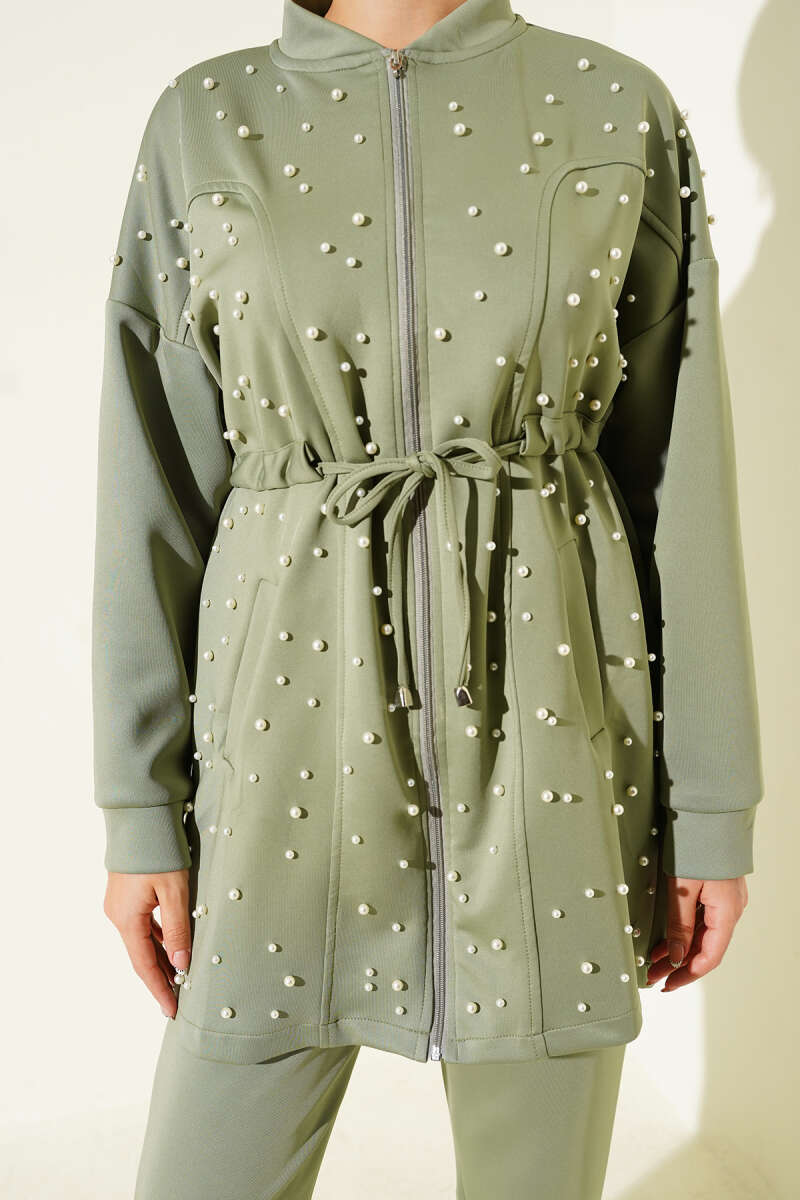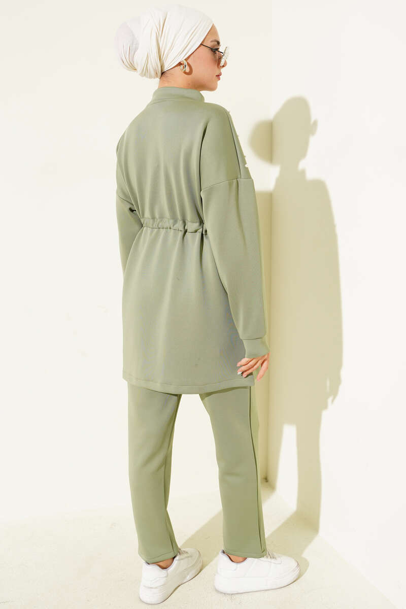 Fırfır Detaylı Fermuarlı Kapüşonlu İkili Takım Çağla Yeşili