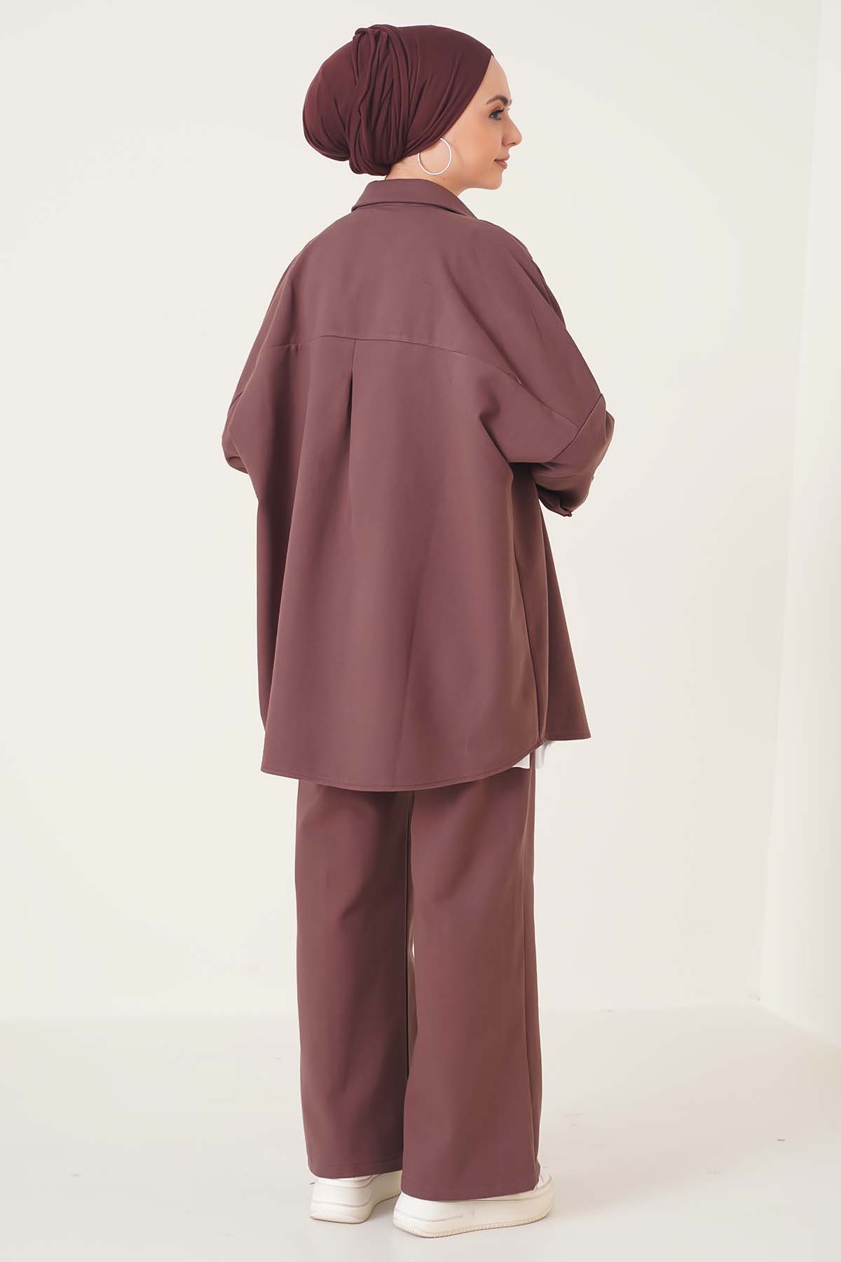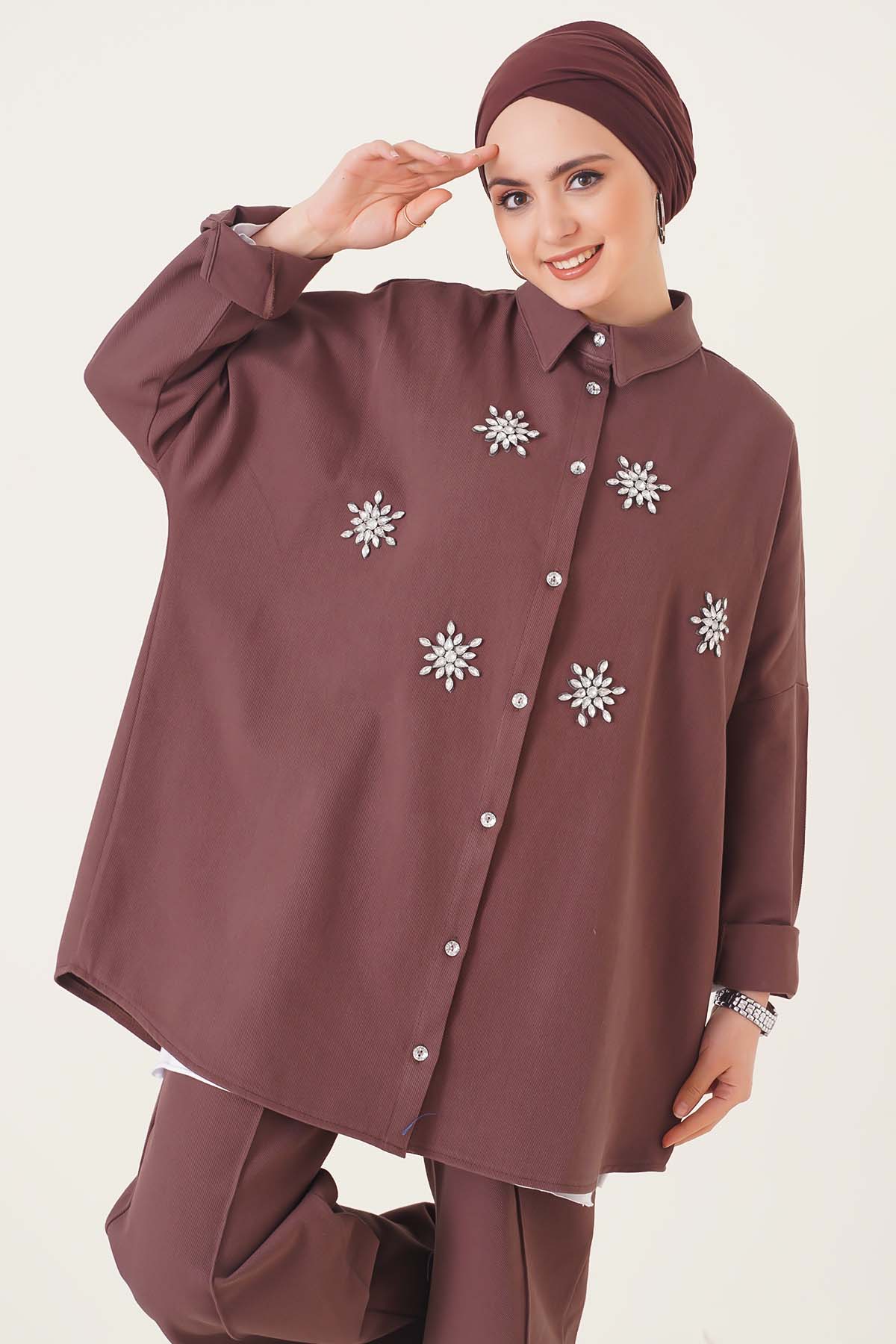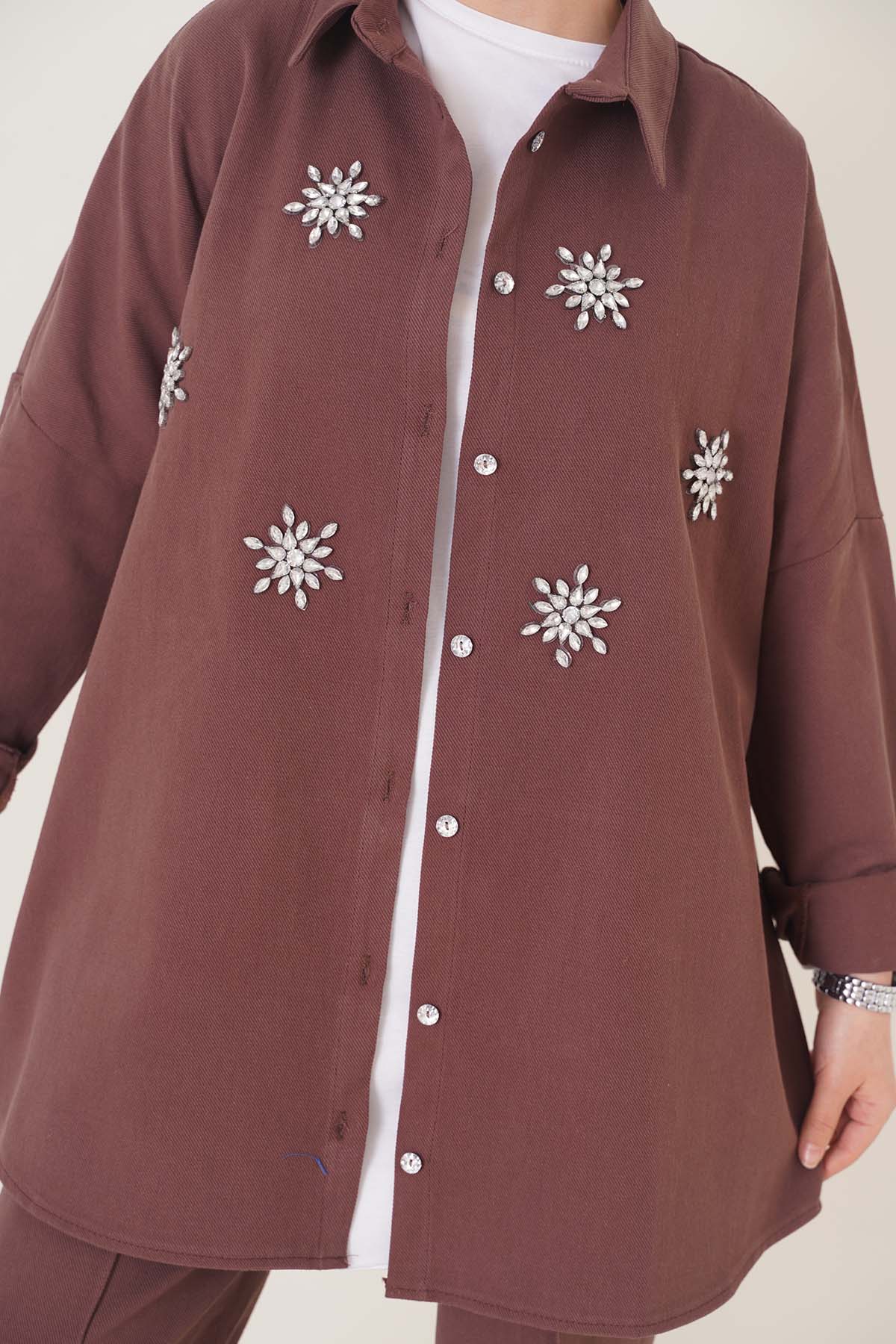 Kadın giyimde kurtarıcı parçaların başında gelen takımlar sizinle. Ceketinde taş işlemeleri bulunmaktadır. Boydan düğmelidir. Pantolonun beli lastikli olup cepsizdir.