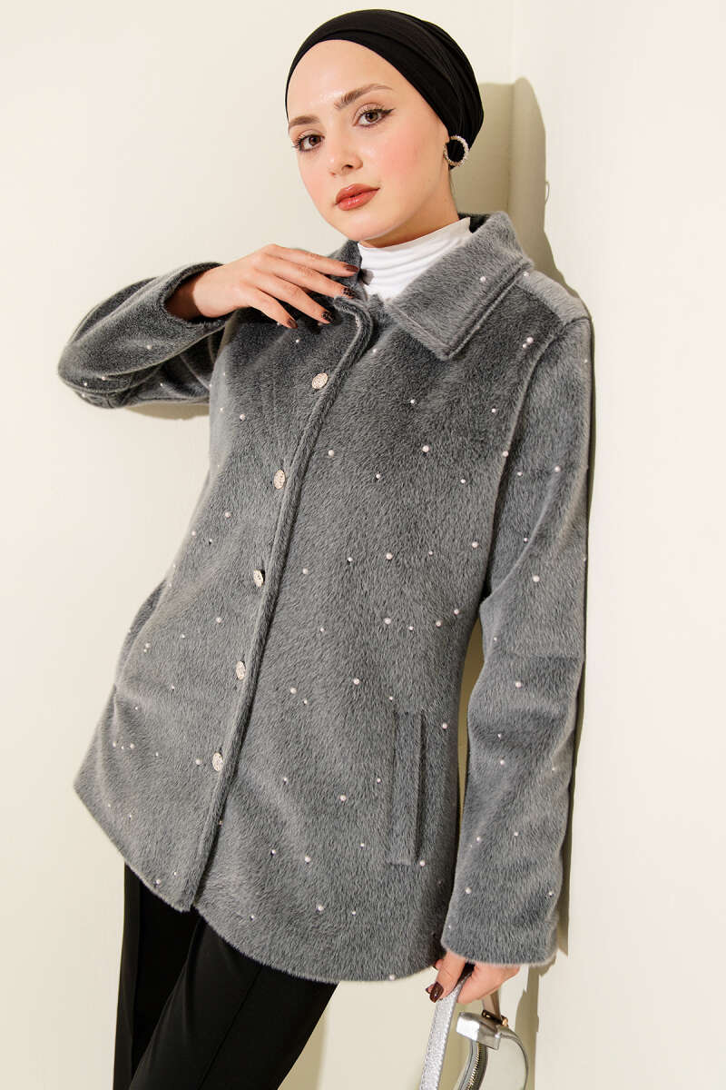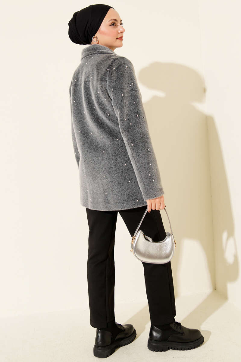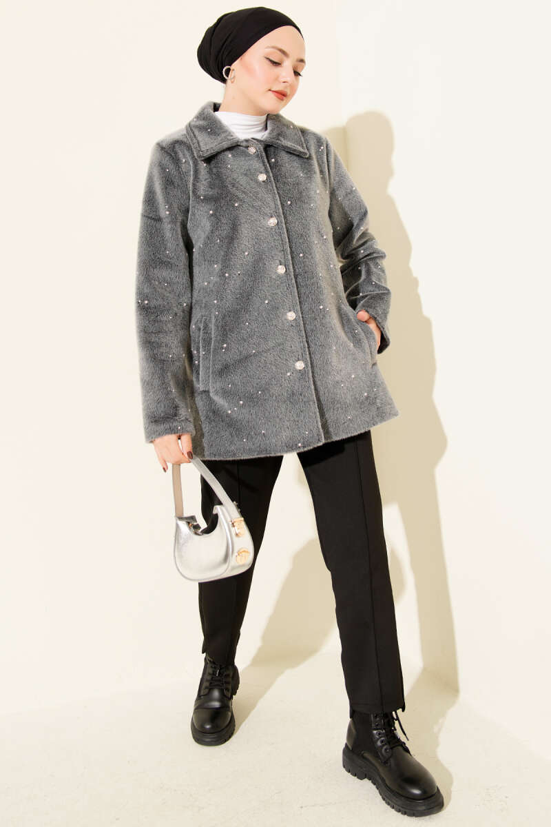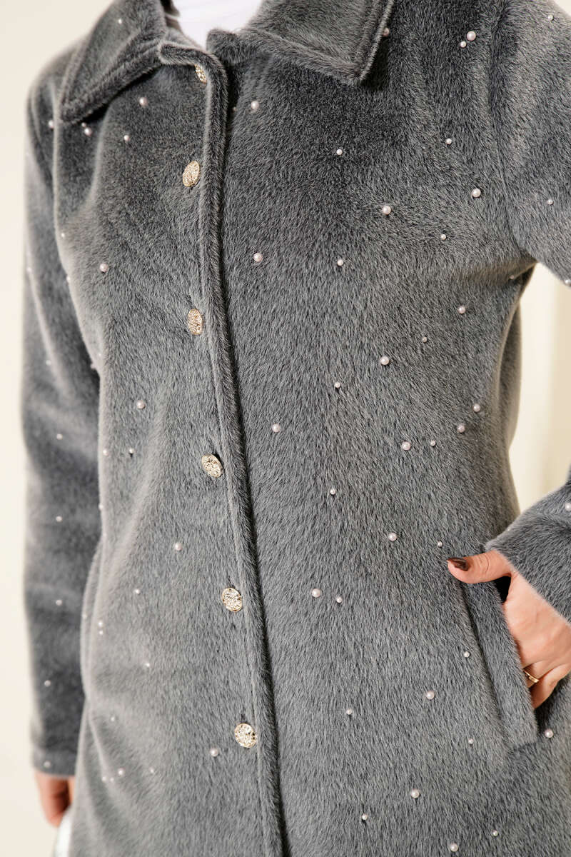 İncili Düğmeli Tay Tüyü Kaban Siyah