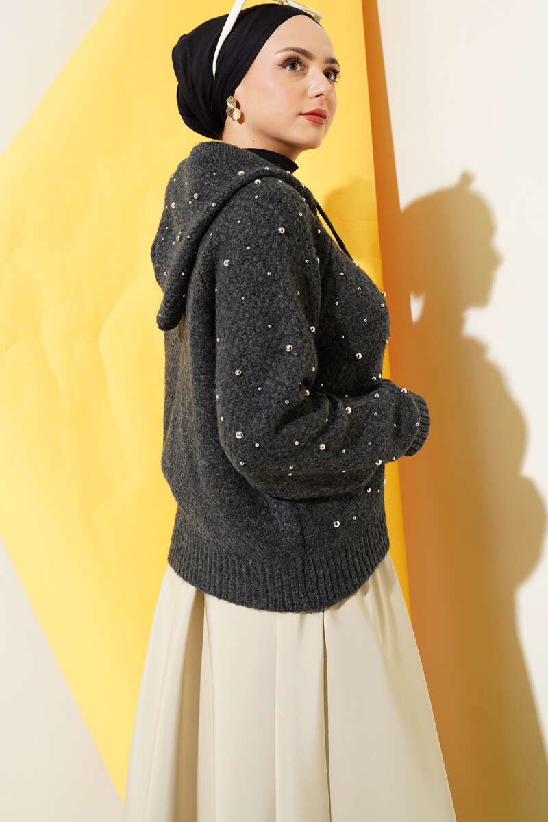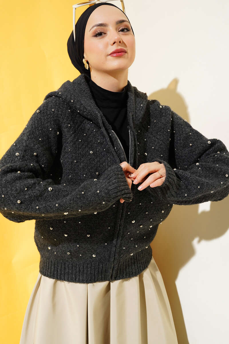 İncili Kapüşonlu Kısa Triko Hırka Antrasit