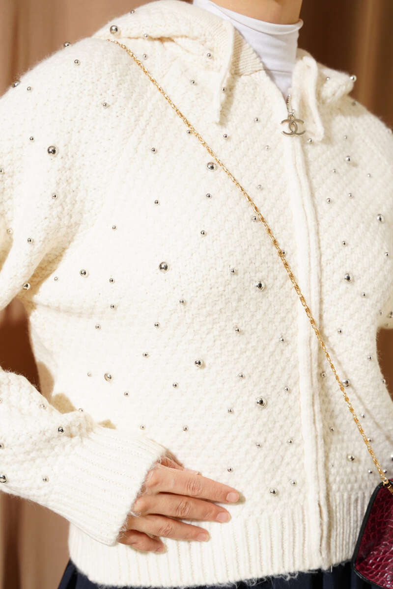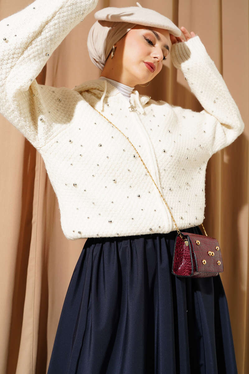 İncili Kapüşonlu Kısa Triko Hırka Kemik