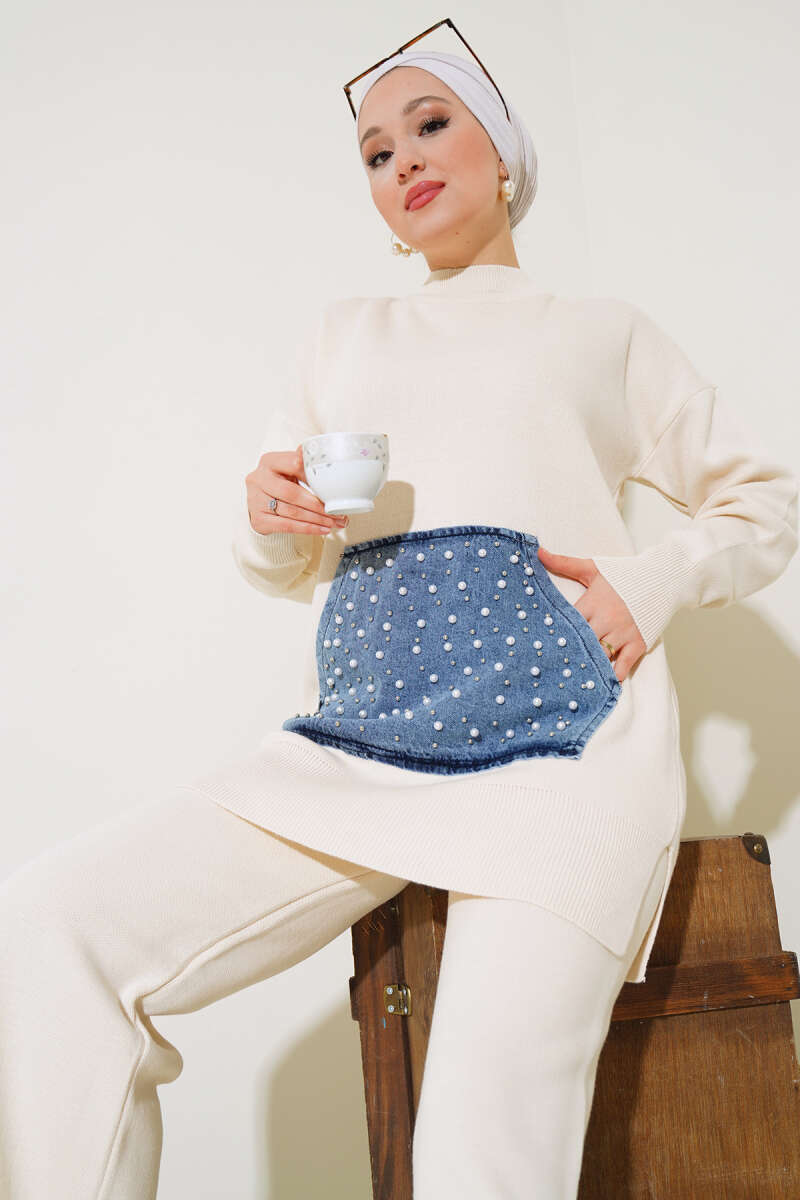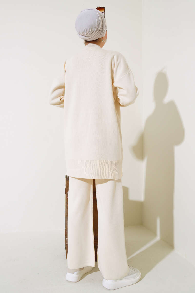 Dikiş Detaylı Basic Triko İkili Takım Bej