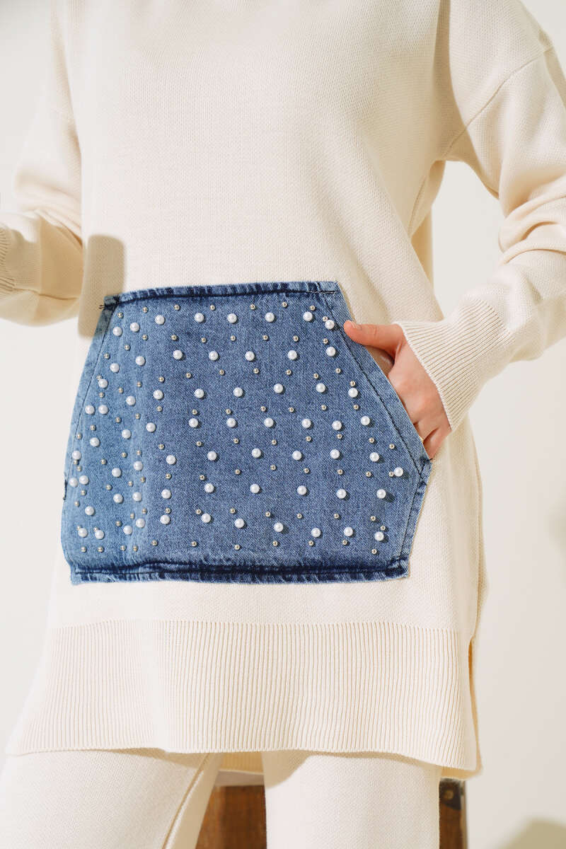 Kabartma Şeritli Taşlı Triko İkili Takım Nefti
