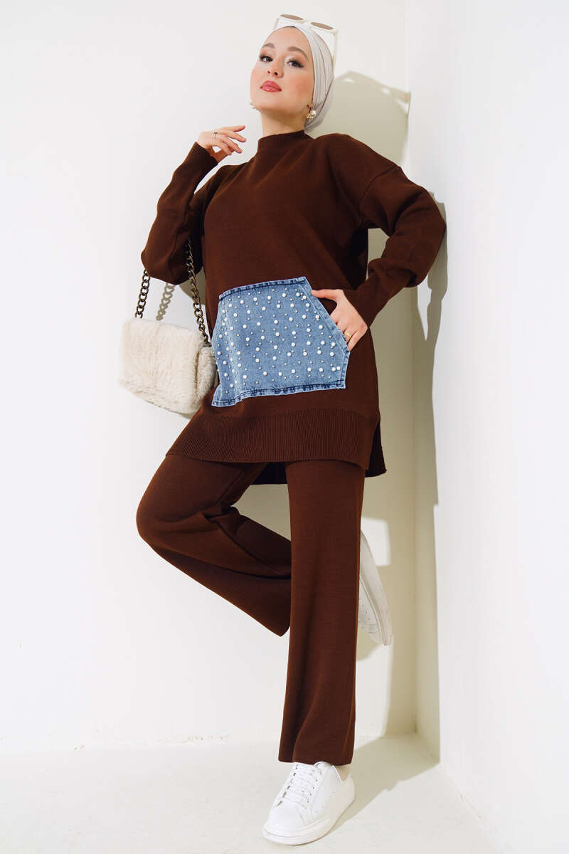 Taşlı Baklava Desen Triko İkili Takım Kahve