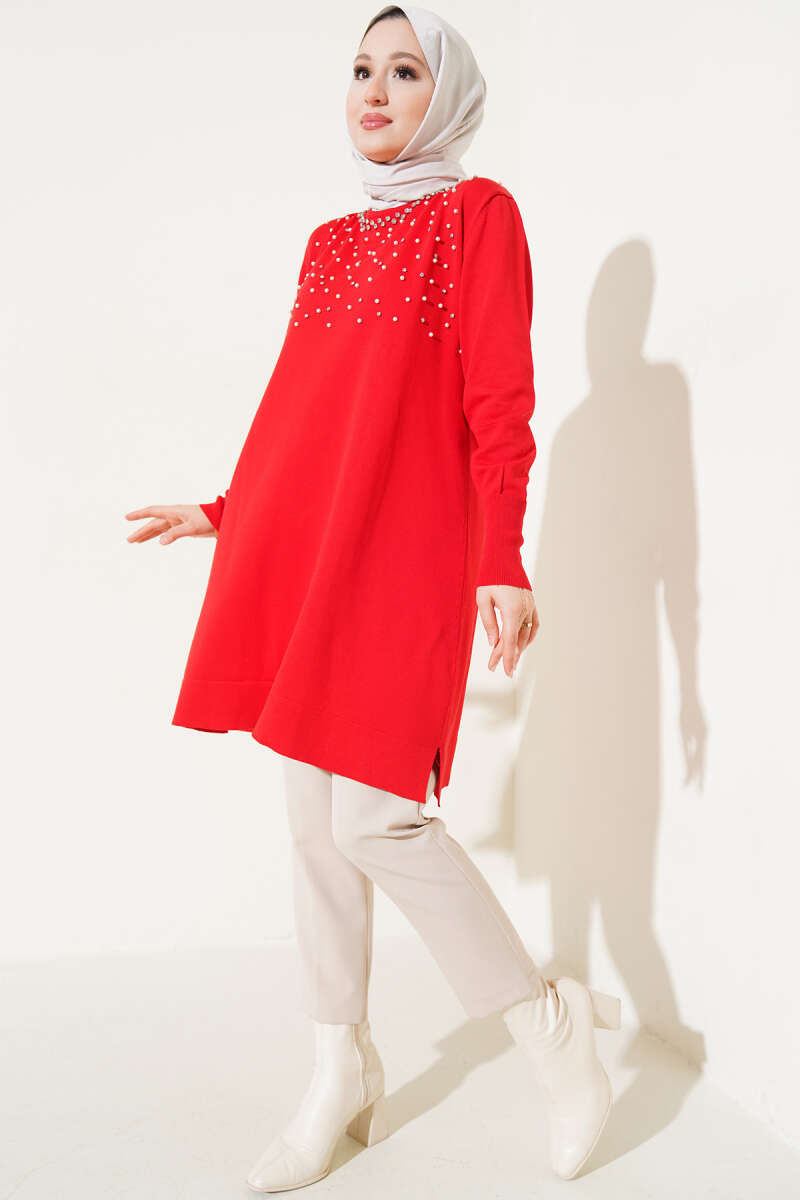 Gömlek Yaka Fularlı Triko Tunik Bordo