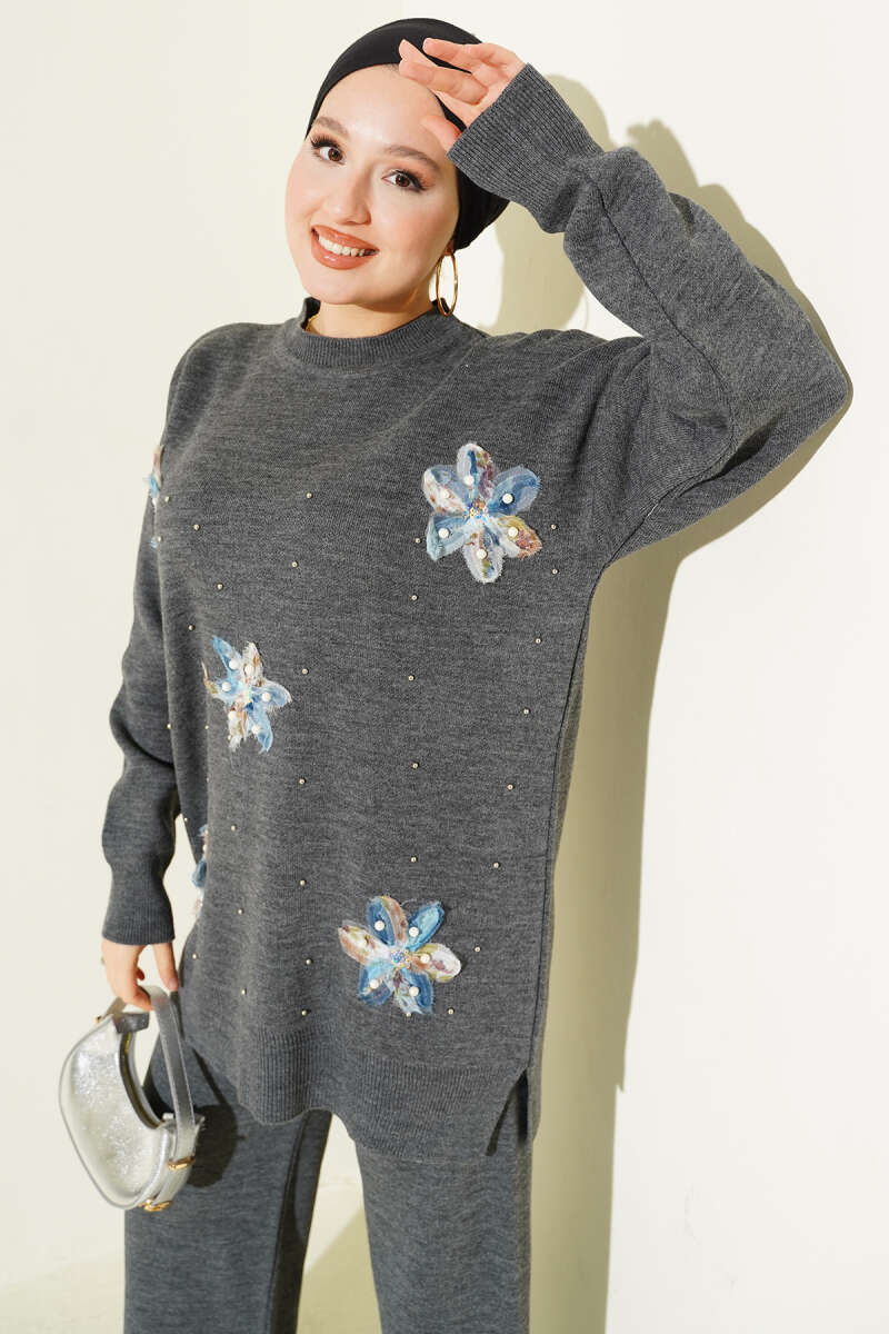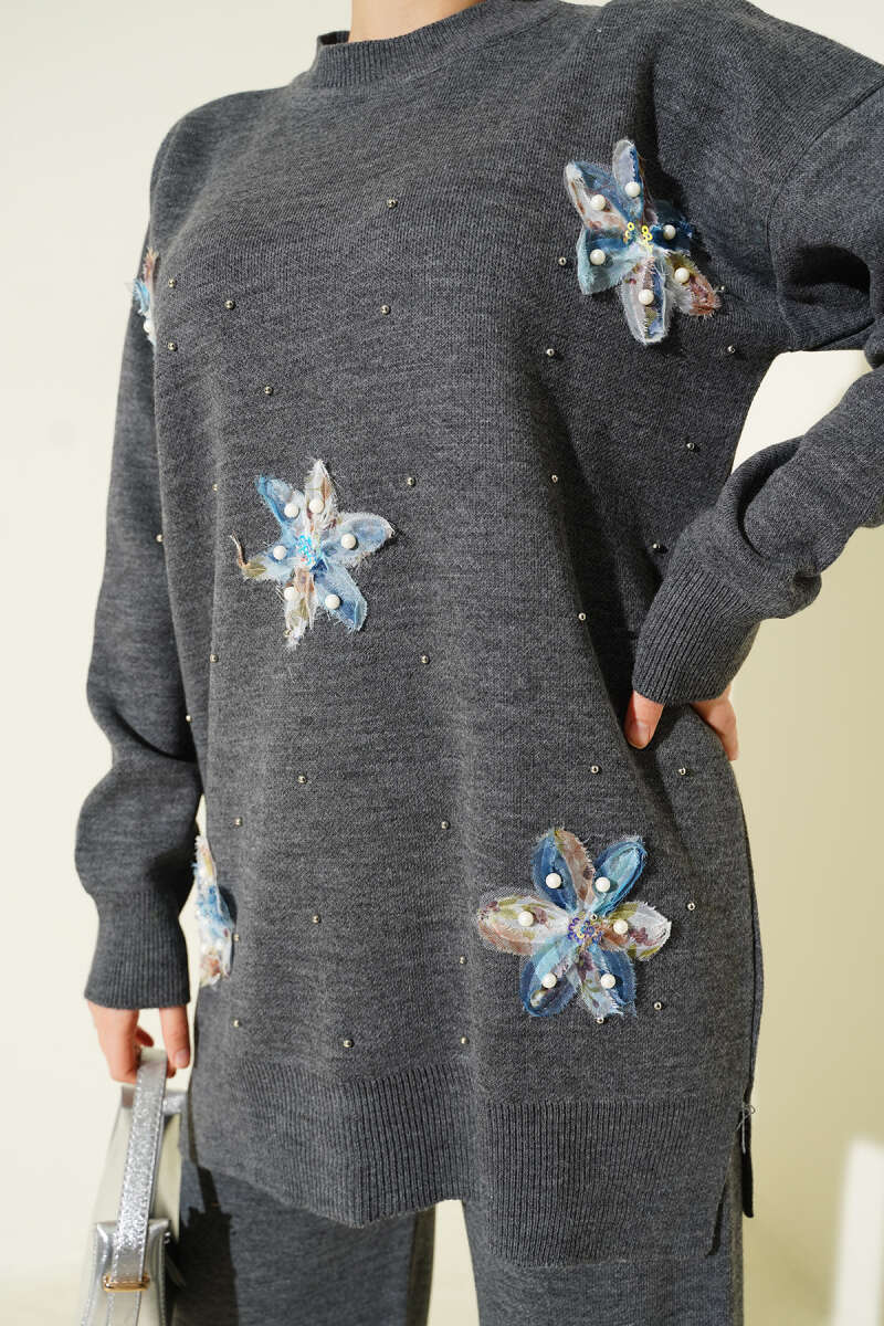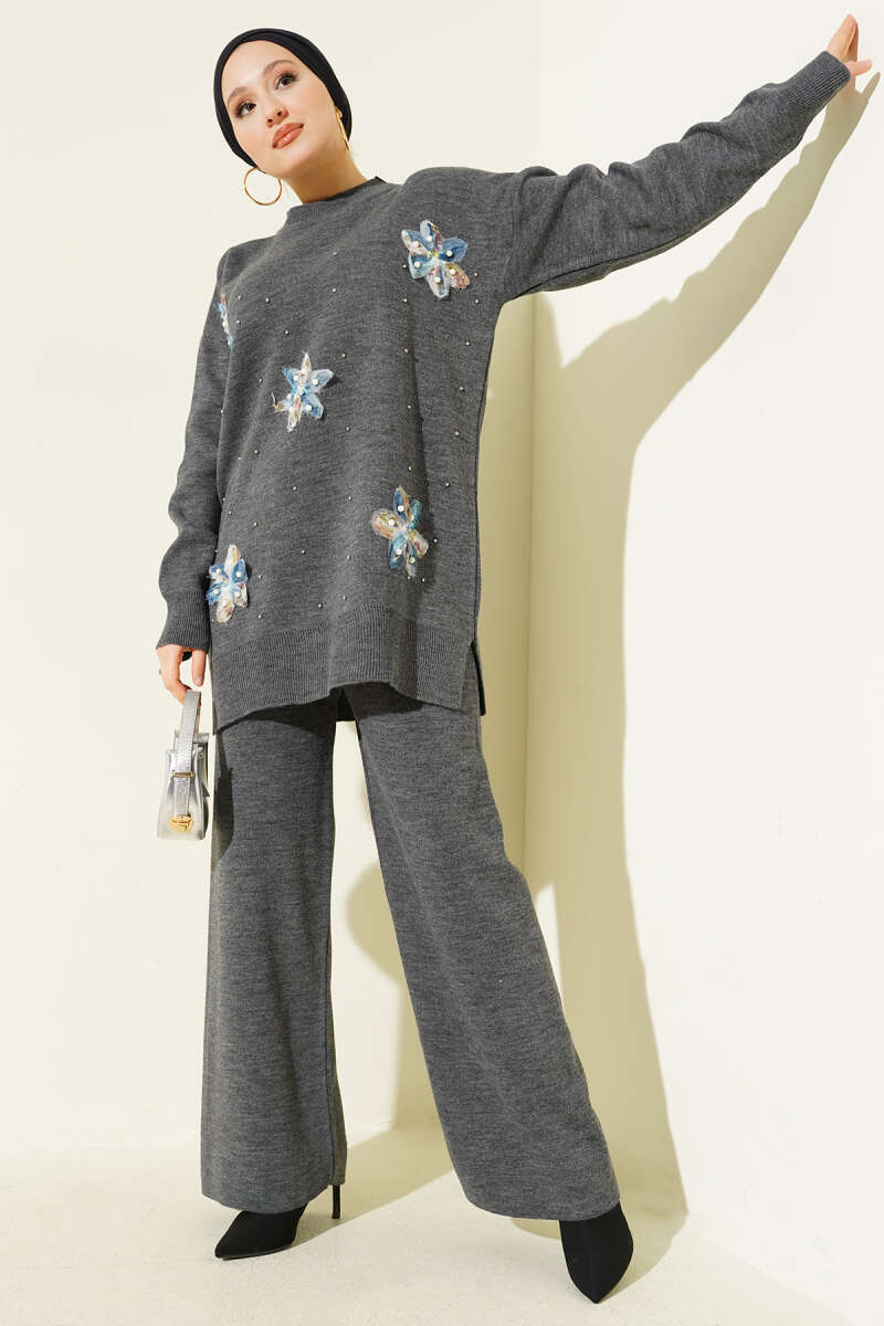 İncili Tül Çiçekli Triko İkili Takım Kahve