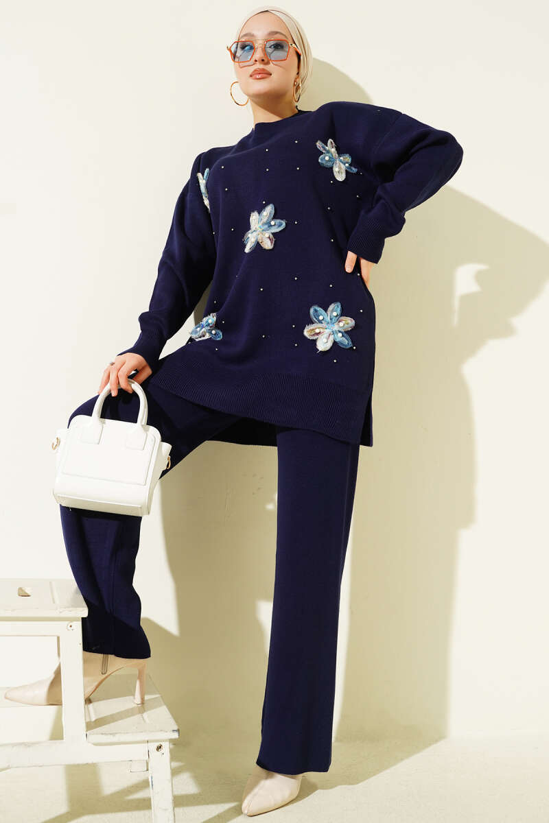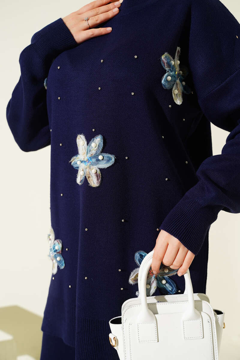 İncili Tül Çiçekli Triko İkili Takım Siyah