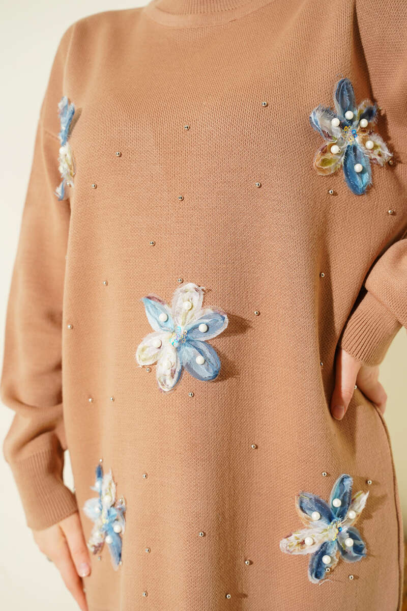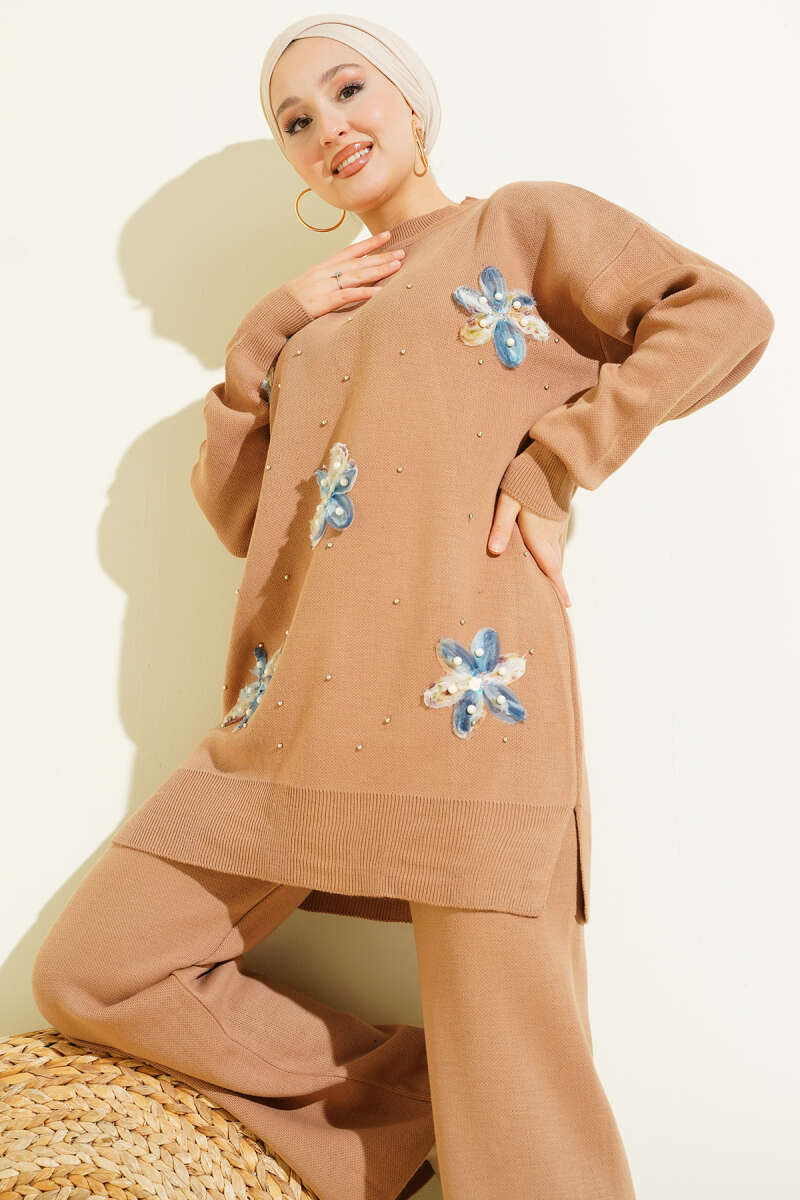 İncili Tül Çiçekli Triko İkili Takım Kahve