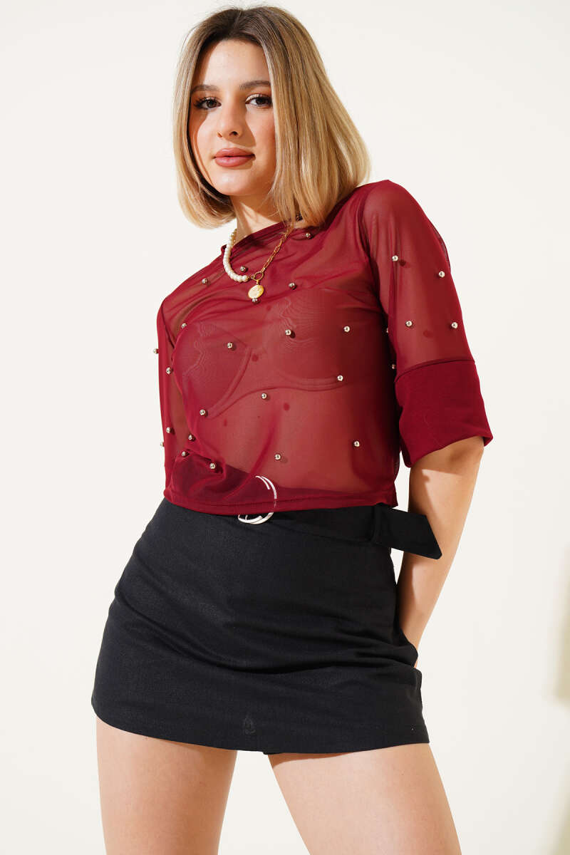 İncili Yarım Kol Tül Bluz Bordo
