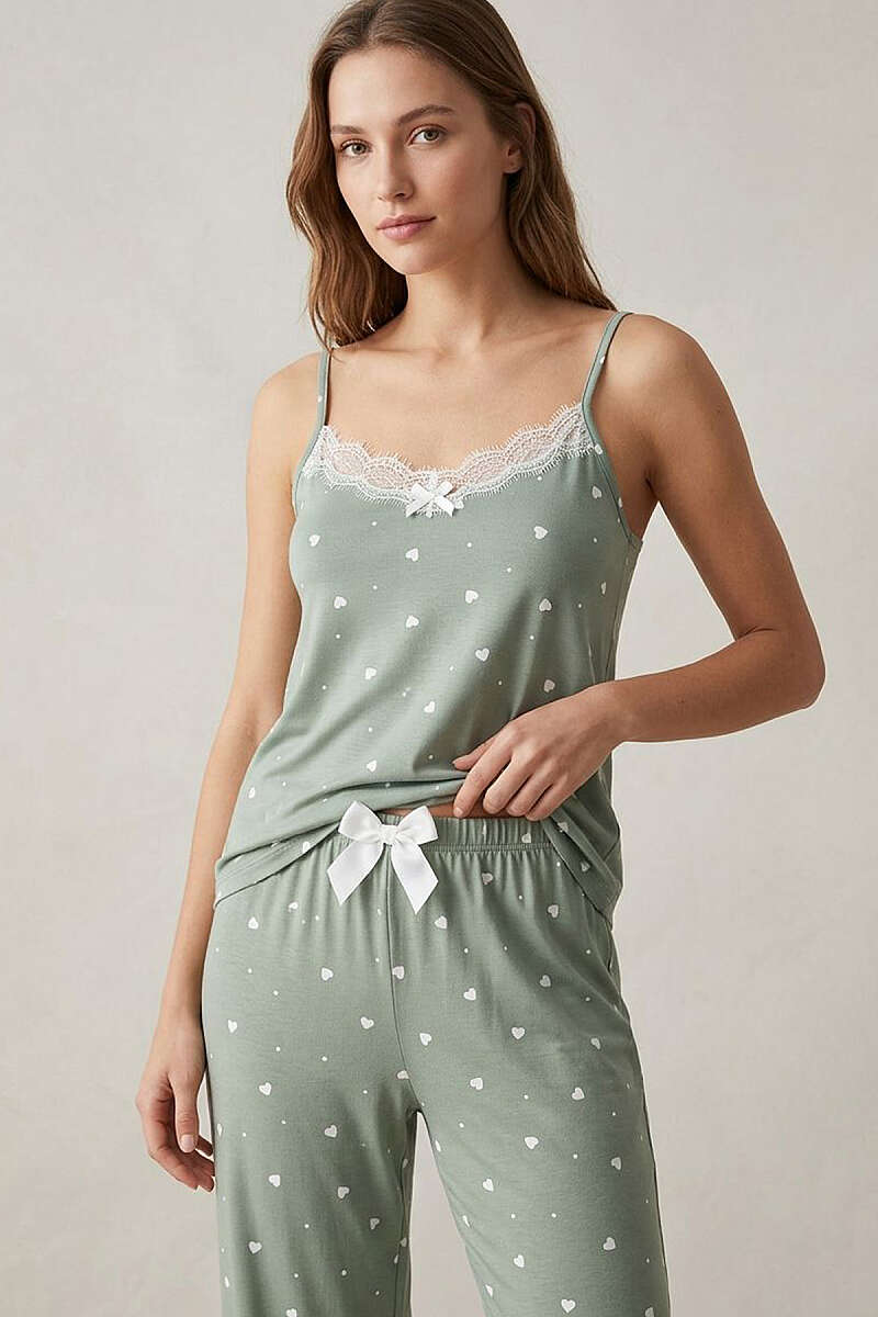 İp Askılı Dantelli Kalp Baskılı Askılı Pijama Takımı Çağla Yeşili