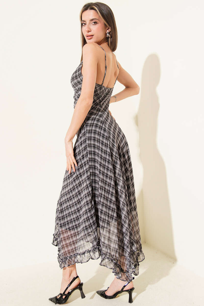 İp Askılı Ekoseli Şifon Elbise Siyah