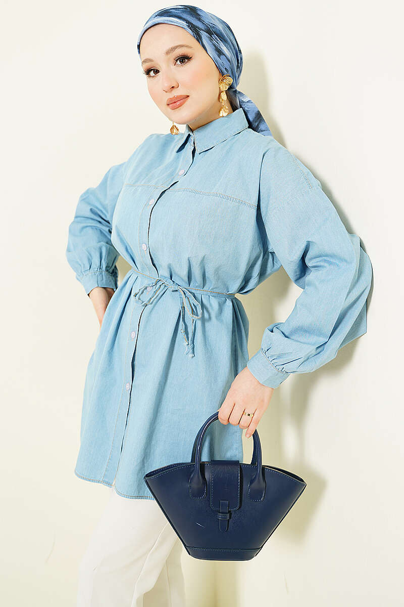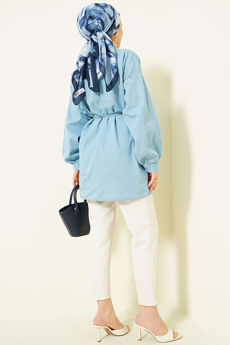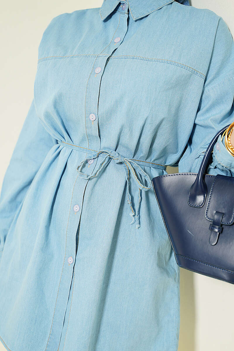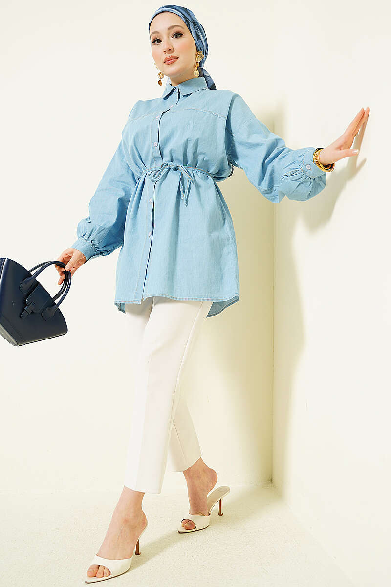 İp Bağcıklı Balon Kol Kot Gömlek Buz Mavisi