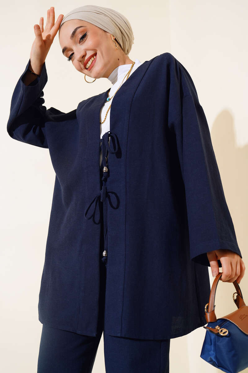 Desenli İp Bağcıklı Kimono Mavi