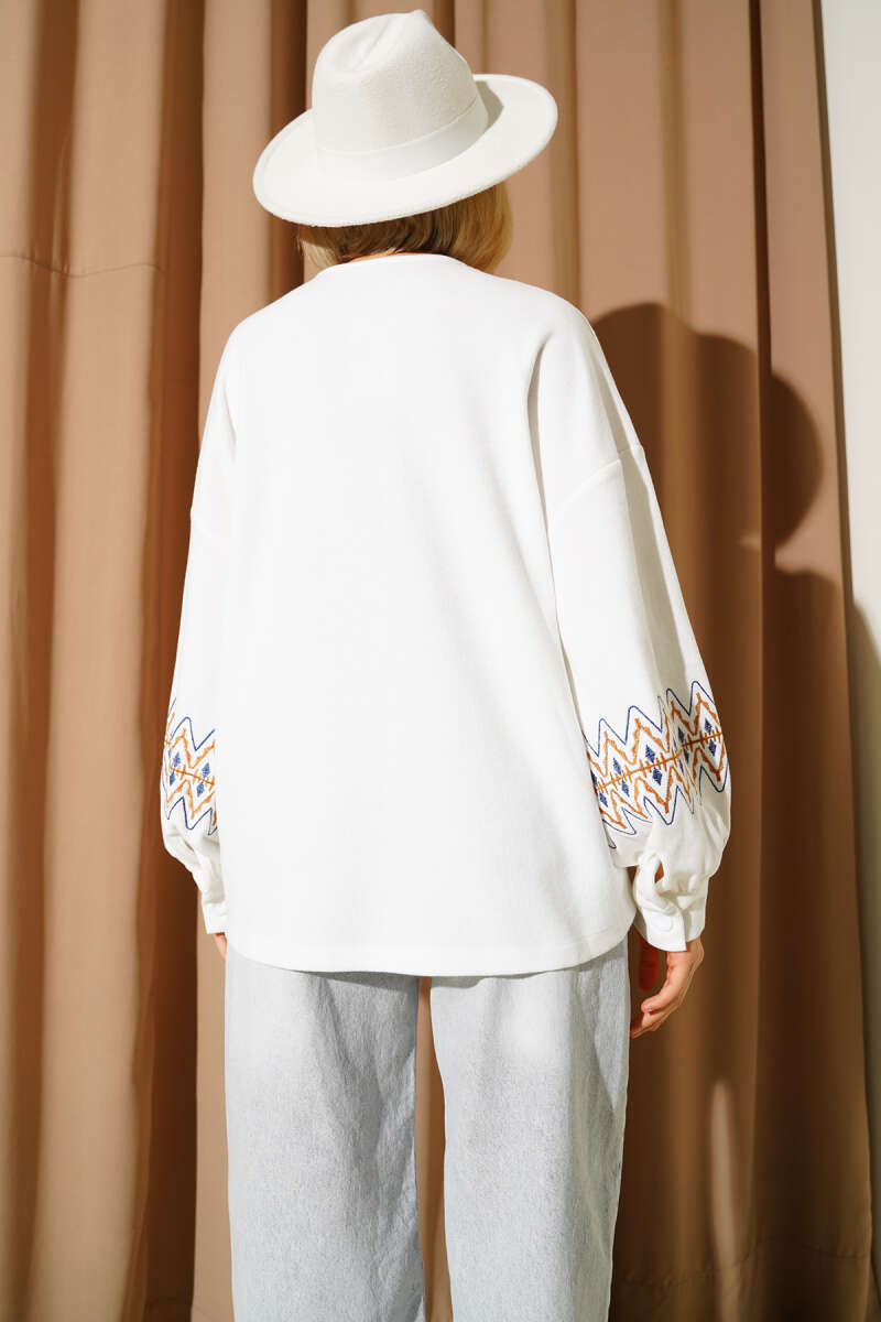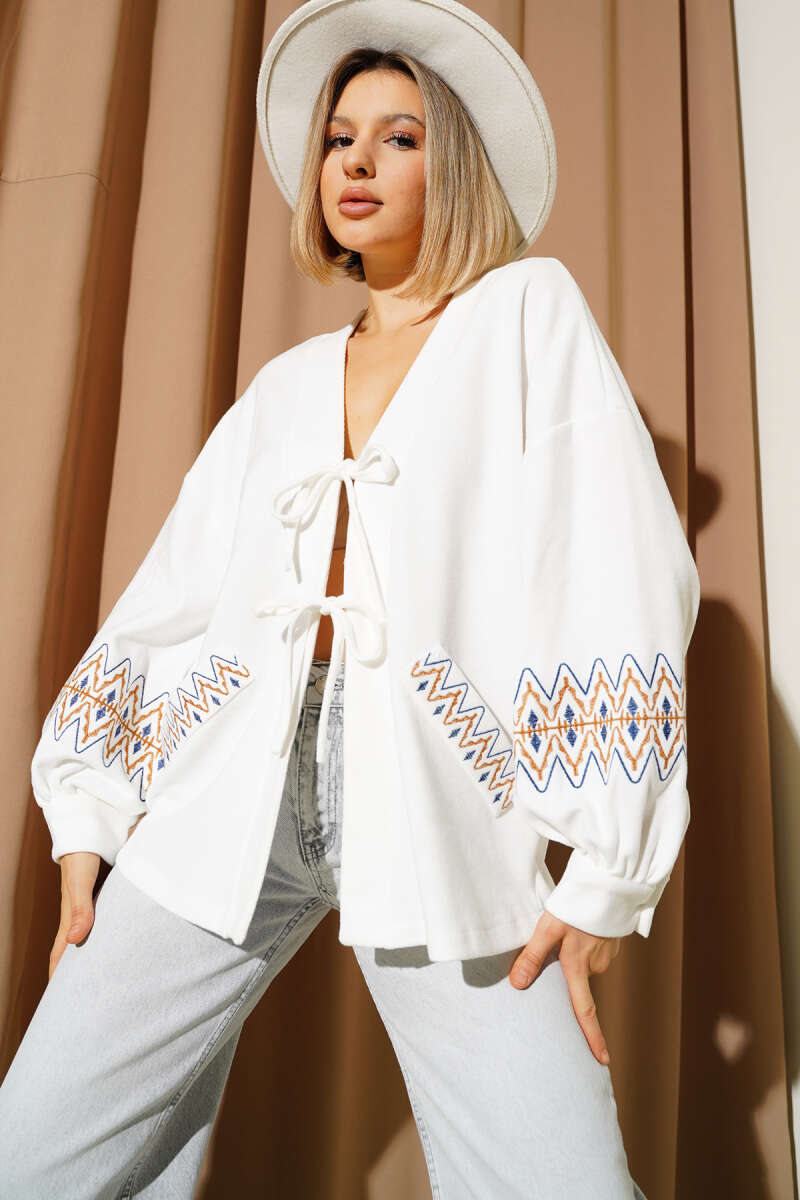 İp Bağcıklı Nakışlı Hırka Beyaz